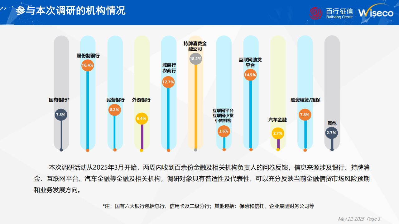 本次调研活动从2025年3月开始,两周内收到百余份金融及相关机构负责人的问卷反馈,信息来源涉及银行、持牌消金、互联网平台、汽车金融等金融及相关机构,调研对象具有普适性及代表性。可以充分反映当前金融信贷市场风险预期和业务发展方向。