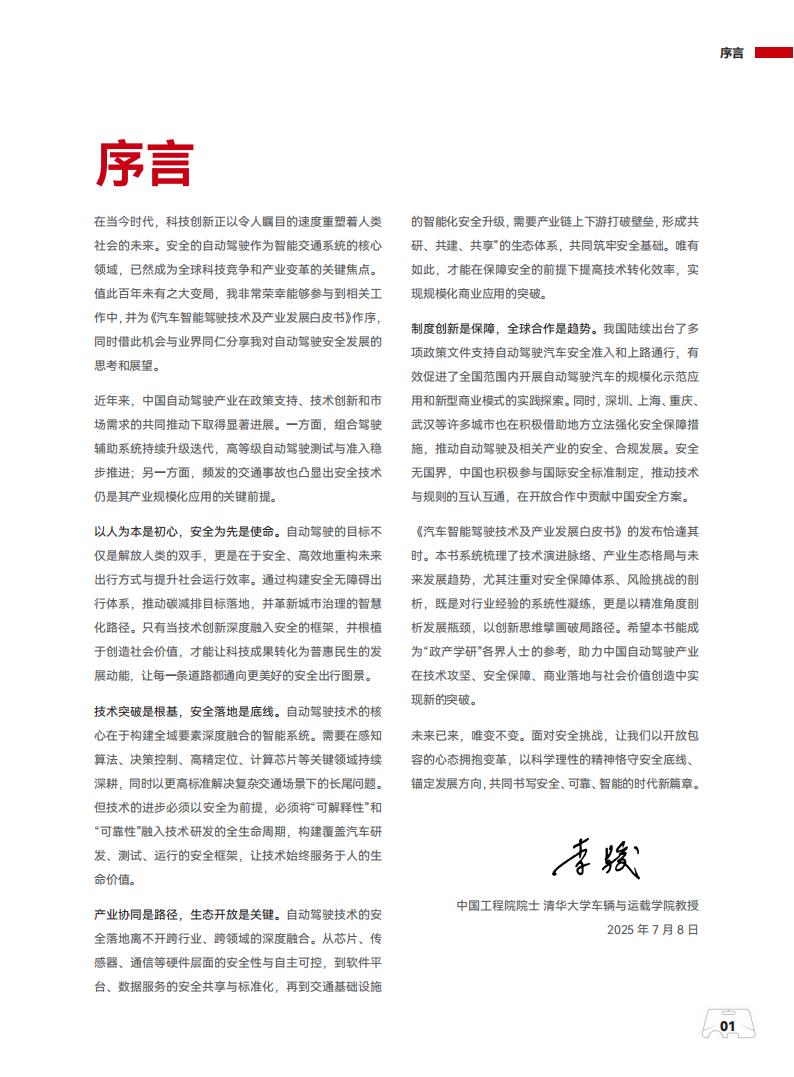 《汽车智能驾驶技术及产业发展白皮书》的发布恰逢其时。本书系统梳理了技术演进脉络、产业生态格局与未来发展趋势,尤其注重对安全保障体系、风险挑战的剖析,既是对行业经验的系统性凝练,更是以精准角度剖析发展瓶颈,以创新思维擘画破局路径。希望本书能成为“政产学研”各界人士的参考,助力中国自动驾驶产业在技术攻坚、安全保障、商业落地与社会价值创造中实现新的突破。