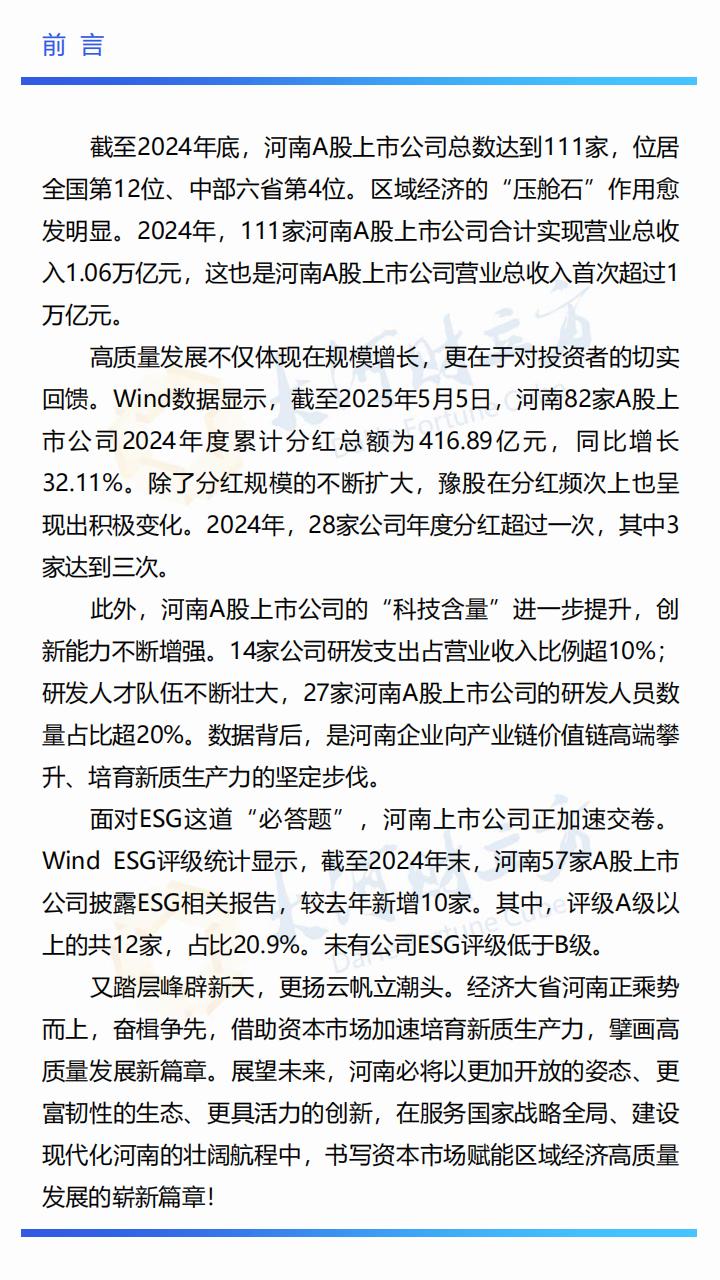 在这场关乎资本市场未来的深刻变革中,作为经济大省的河南,以其厚重的产业底蕴与蓬勃的创新活力,主动融入国家战略大局,乘改革东风,向“新”而行,以“质”致远。回望2024,河南资本市场交出了一份亮眼的答卷:截至2024年底,河南A股上市公司总数达到111家,位居全国第12位、中部六省第4位。区域经济的“压舱石”作用愈发明显。2024年,111家河南A股上市公司合计实现营业总收入1.06万亿元,这也是河南A股上市公司营业总收入首次超过1万亿元。
