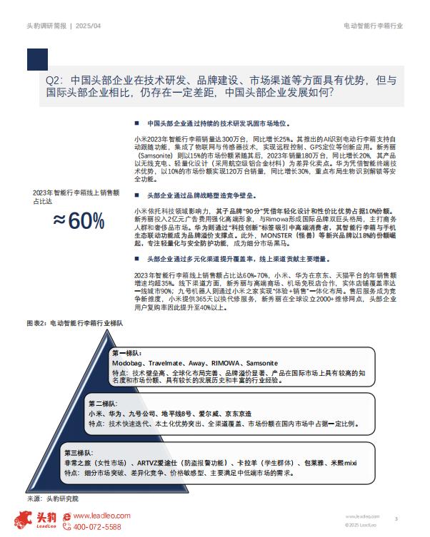 2023年智能行李箱线上销售额占比达60%-70%,小米、华为在京东、天猫平台的年销售额增速均超35%。线下渠道方面,新秀丽与高端商场、机场免税店合作,实体店铺覆盖率达一线城市90%;九号机器人则通过小米之家实现”体验+销售”一体化布局。售后服务成为竞争新维度,小米提供365天以换代修服务,新秀丽在全球设立2000+维修网点,头部企业用户复购率因此提升至40%以上。