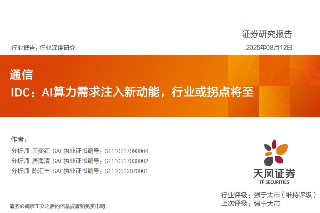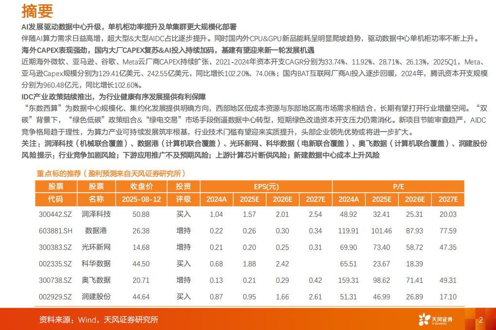 关注:润泽科技(机械联合覆盖)、数据港(计算机联合覆盖)、光环新网、科华数据(电新联合覆盖)、奥飞数据(计算机联合覆盖)、润建股份风险提示:行业竞争加剧风险;下游应用推广不及预期风险;上游计算芯片断供风险;新建数据中心成本上升风险