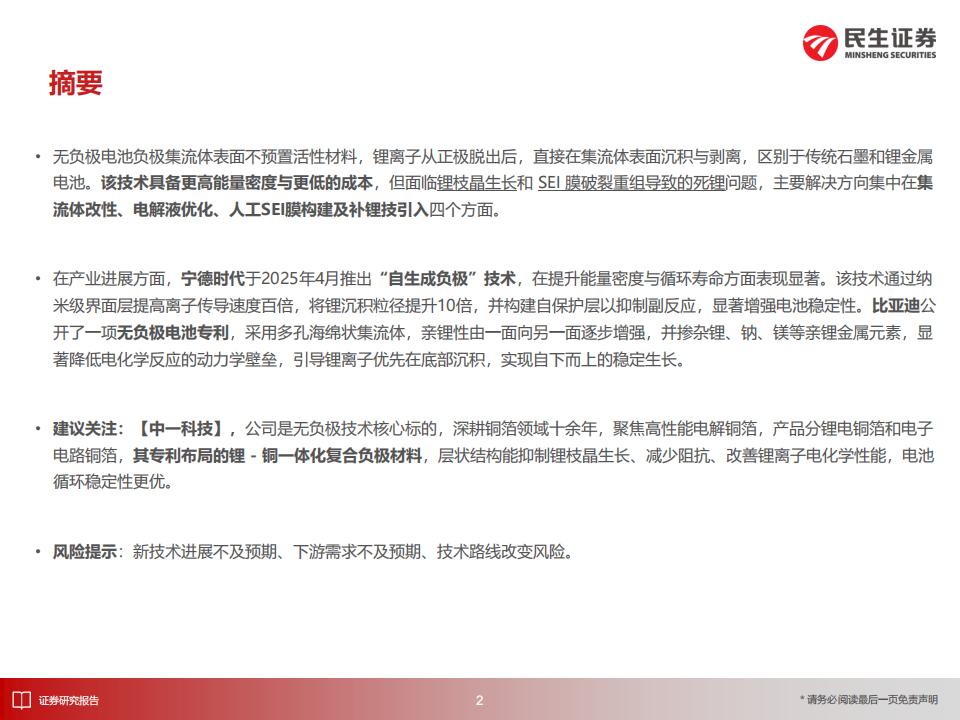 建议关注:【中一科技】,公司是无负极技术核心标的,深耕铜箔领域十余年,聚焦高性能电解铜箔,产品分锂电铜箔和电子电路铜箔,其专利布局的锂-铜一体化复合负极材料,层状结构能抑制锂枝晶生长、减少阻抗、改善锂离子电化学性能,电池循环稳定性更优。