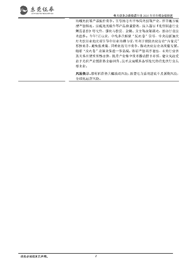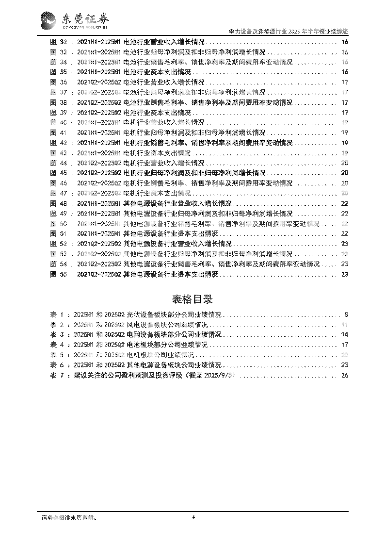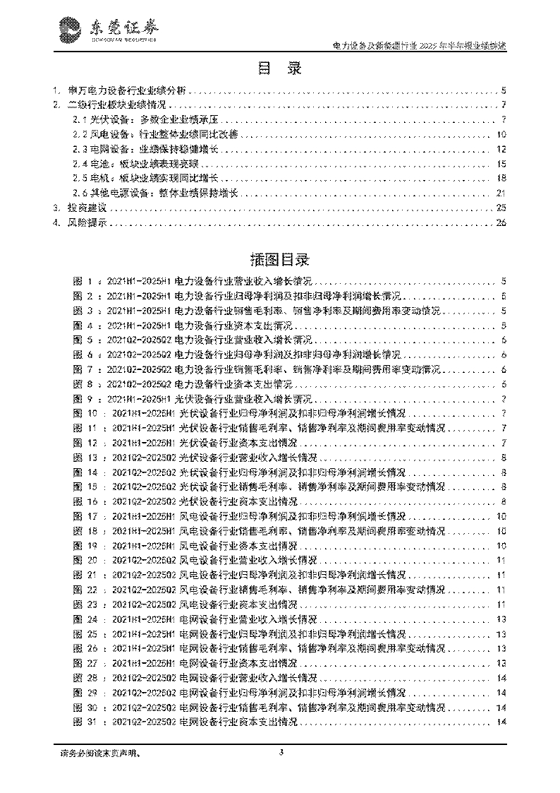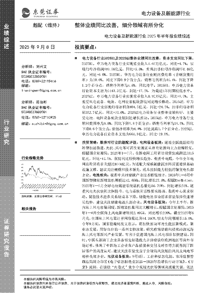 投资策略:维持对行业的超配评级。电网设备板块:随着全国能源结构转型加速推进,光伏、风电等可再生能源正从补充能源向主力能源转变。根据国家能源局,2025年1—7月,全国电网工程累计投资完成额达3315亿元,同比+12.5%,保持同比较快增长趋势。根据中电联,今年全年电网总投资将首次超过8000亿元,为适配大规模新能源并网需要提供基础设施支撑。建议关注规模和技术领先,成本控制能力较强的输变电头部企业。电池板块:根据中关村储能产业技术联盟统计,2025年1—6月中国新型储能新增装机规模达42.6GWh,同比增长27.5%。根据Rho Motion,2025年1—6月全球电池储能系统装机总量达86.7GWh,同比增长54%。随着风电光伏装机比例提升、电力系统灵活性要求提高、数据中心需求驱动、储能技术进步及系统成本下降,储能电池市场需求有望保持快速增长趋势,建议关注储能电池头部企业。风电设备板块:今年上半年,国内海上风电市场回暖,新增装机量同比大幅增长。根据国家能源局,2025年1—6月全国海上风电新增装机2.49GW,同比增长200%,截至2025年6月底,全国海上风电累计并网容量达到44.20GW,较去年同期增长15.8%。今年9月初,国家能源局发文表示,将加快推动可再生能源新模式、新业态发展,用好出台的一系列支持政策,研究政策措施积极推动深远海海上风电等新兴产业发展,有利于促进国内海上风电项目加快建设。同时,中国头部海工企业具备领先制造能力并持续获取欧洲地区等海外市场订单,体现了中国海工企业在产品质量和交付及时性等方面得到了国际客户的高度认可。建议关注有望受益于全球海风发展的风机及风电零部件头部企业。光伏设备板块:9月4日,工业和信息化部、市场监督管理总局联合印发《电子信息制造业2025-2026年稳增长行动方案》,《方案》提到,在破除“内卷式”竞争中实现光伏等领域高质量发展,依法治理光伏等产品低价竞争。引导地方有序布局光伏等产业,指导地方梳理产能情况。实施光伏组件等产品质量管理,深入落实《光伏制造行业规范条件》等文件,强化与投资、金融、安全等政策联动,推动行业技术进步。今年7月以来,中央多次释放“反内卷”信号,中央层面加大对光伏行业的宏观引导和行业治理力度,有利于破除光伏行业“内卷式”恶性竞争,避免低质量、同质化的无序竞争,推动光伏行业高质量发展。随着“反内卷”政策效果进一步显现,落后产能有序退出,未来行业供需关系有望实质性改善,提升产业集中度并推动技术革新,建议关注受益于光伏产业链价格企稳回升、技术及规模具备领先优势的光伏行业头部企业。