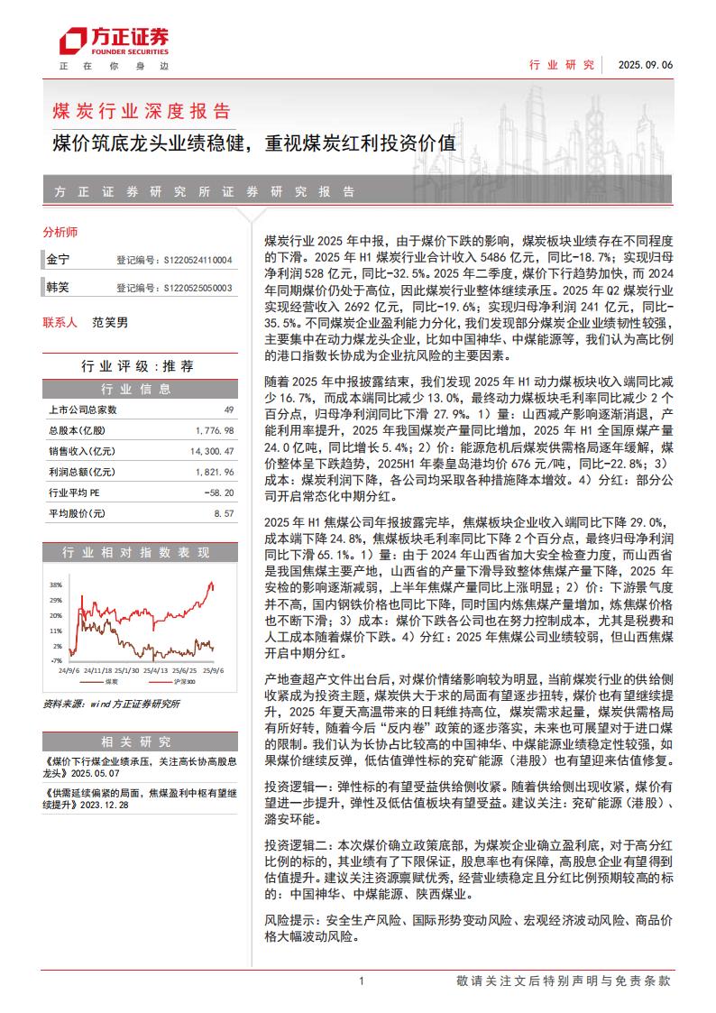 产地查超产文件出台后,对煤价情绪影响较为明显,当前煤炭行业的供给侧收紧成为投资主题,煤炭供大于求的局面有望逐步扭转,煤价也有望继续提升,2025年夏天高温带来的日耗维持高位,煤炭需求起量,煤炭供需格局有所好转,随着今后“反内卷”政策的逐步落实,未来也可展望对于进口煤的限制。我们认为长协占比较高的中国神华、中煤能源业绩稳定性较强,如果煤价继续反弹,低估值弹性标的兖矿能源(港股)也有望迎来估值修复。