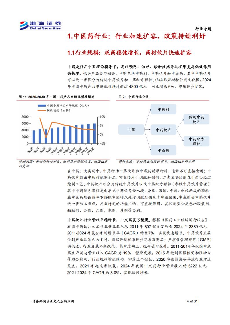 中药饮片行业营收平稳增长,中成药复苏缓慢。根据《医药工业经济运行报告》,我国中药饮片加工行业营业收入从2011年807亿元发展至2024年2389亿元,2011-2024年复合年均增长率(CAGR)约8.7%,实现快速增长。中药饮片主要受到产业政策大力支持、国家炮制标准逐步完善及药品生产质量管理规范(GMP)的促进,行业发展不断规范,集中度向上,规模稳步提升。2011-2014年我国中成药生产制造营业收入CAGR为19%,繁荣发展,2015年受到医保控费和限输令等综合影响,行业规模增速降档,回落至个位数。2020年疫情影响导致行业增速见底,2021年起逐步恢复,2024年我国中成药行业营业收入约5222亿元,2021-2024年CAGR为3.0%,实现缓慢增长。