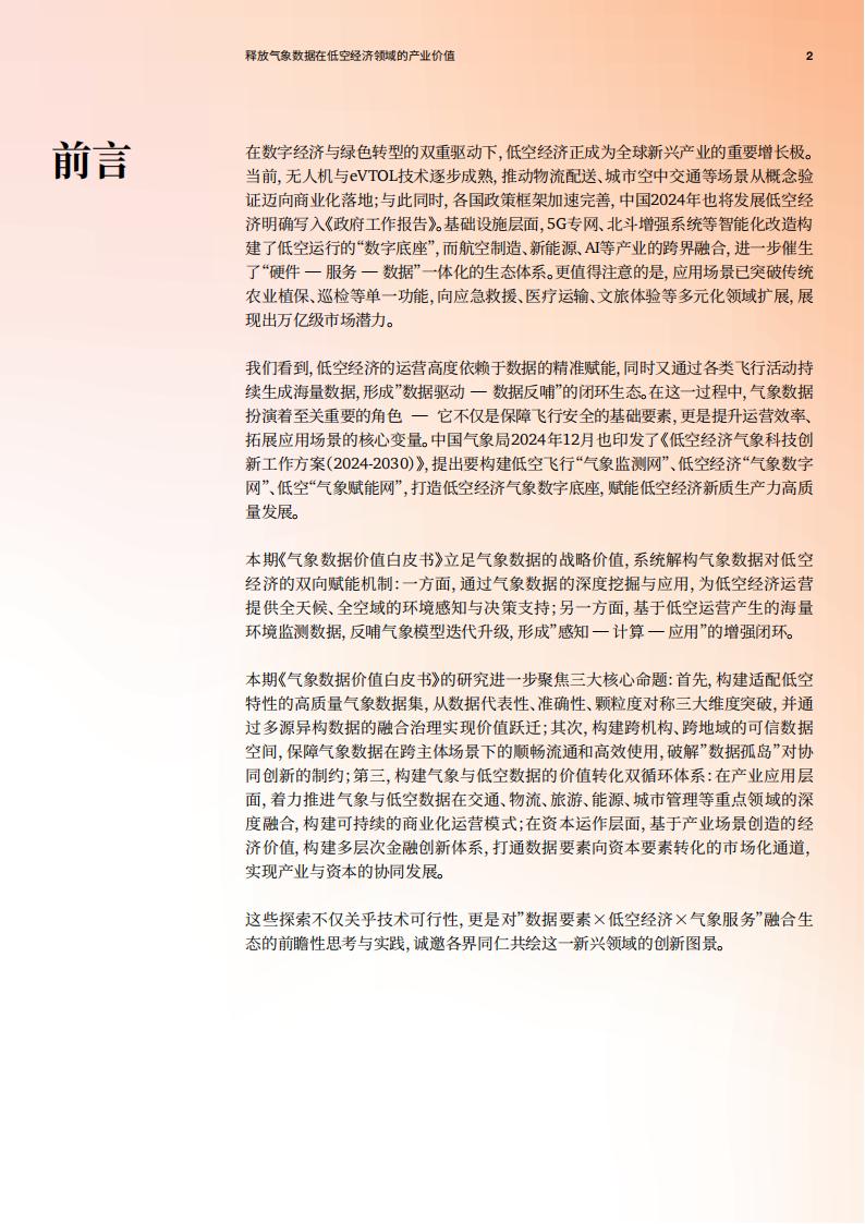 本期《气象数据价值白皮书》的研究进一步聚焦三大核心命题:首先,构建适配低空特性的高质量气象数据集,从数据代表性、准确性、颗粒度对称三大维度突破,并通过多源异构数据的融合治理实现价值跃迁;其次,构建跨机构、跨地域的可信数据空间,保障气象数据在跨主体场景下的顺畅流通和高效使用,破解”数据孤岛”对协同创新的制约;第三,构建气象与低空数据的价值转化双循环体系:在产业应用层面,着力推进气象与低空数据在交通、物流、旅游、能源、城市管理等重点领域的深度融合,构建可持续的商业化运营模式;在资本运作层面,基于产业场景创造的经济价值,构建多层次金融创新体系,打通数据要素向资本要素转化的市场化通道,实现产业与资本的协同发展。