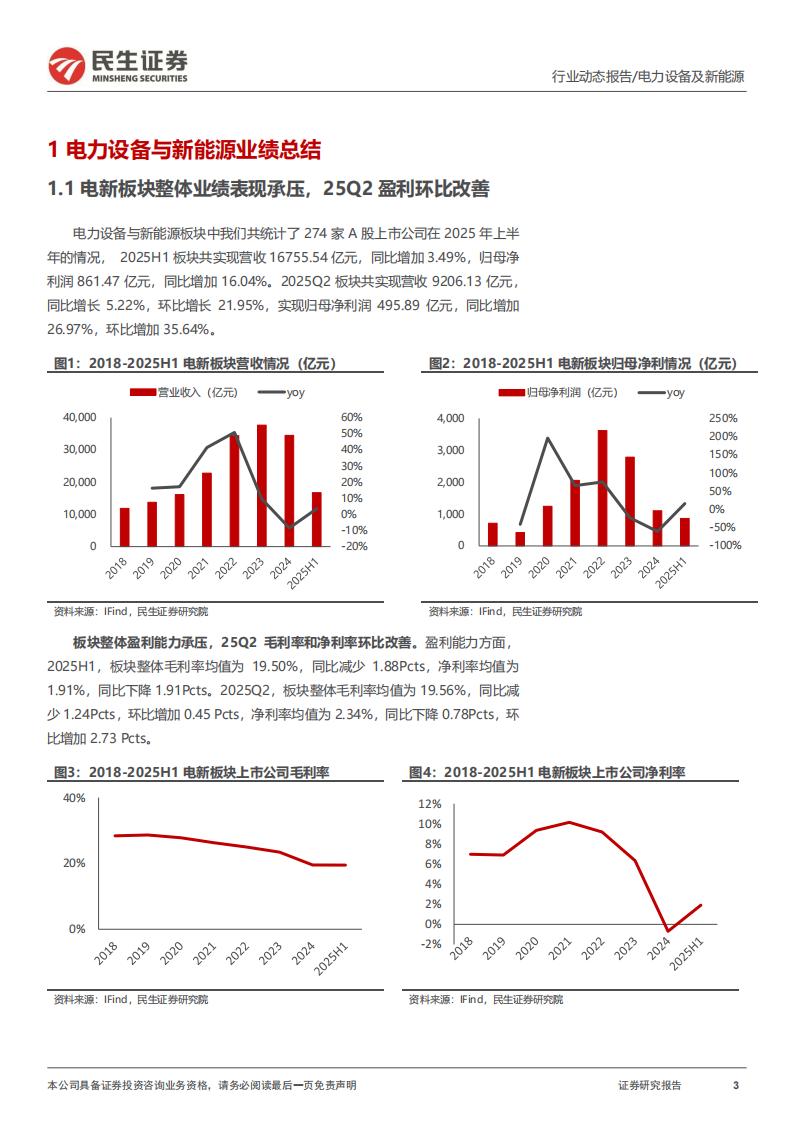 电力设备板块:25H1业绩稳健。2025H1电网板块合计实现营收1740.49亿元,同比增长10%;实现归母净利润139.98亿元,同比增长10%。25Q2板块保持增长趋势,收入实现1045.20亿元,同比增长12%;归母净利润实现90.71亿元,同比增长8%。25H1板块毛利率为25.57%,同比下降1.52pcts;净利率为7.33%,同比上升0.72pct,25H1盈利能力有所承压判断主要系大宗材料价格波动小幅影响。