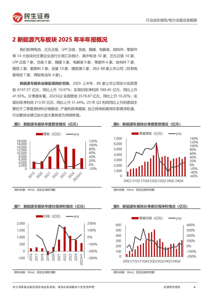 新能源车板块:业绩呈现向好态势。2025H1板块实现营收6747.57亿元,同比上升10.67%;归母净利润580.45亿元,同比下降41.93%。2025Q2实现营收3578.87亿元,同比上升10.20%;归母净利润313.93亿元,同比上升31.44%。25Q2板块利润同比上升主要因为Q2原材料价格稳定,产能利用率提高,加之纯电和商用车型需求旺盛,行业整体业绩已由大起大落转变为持续修复。