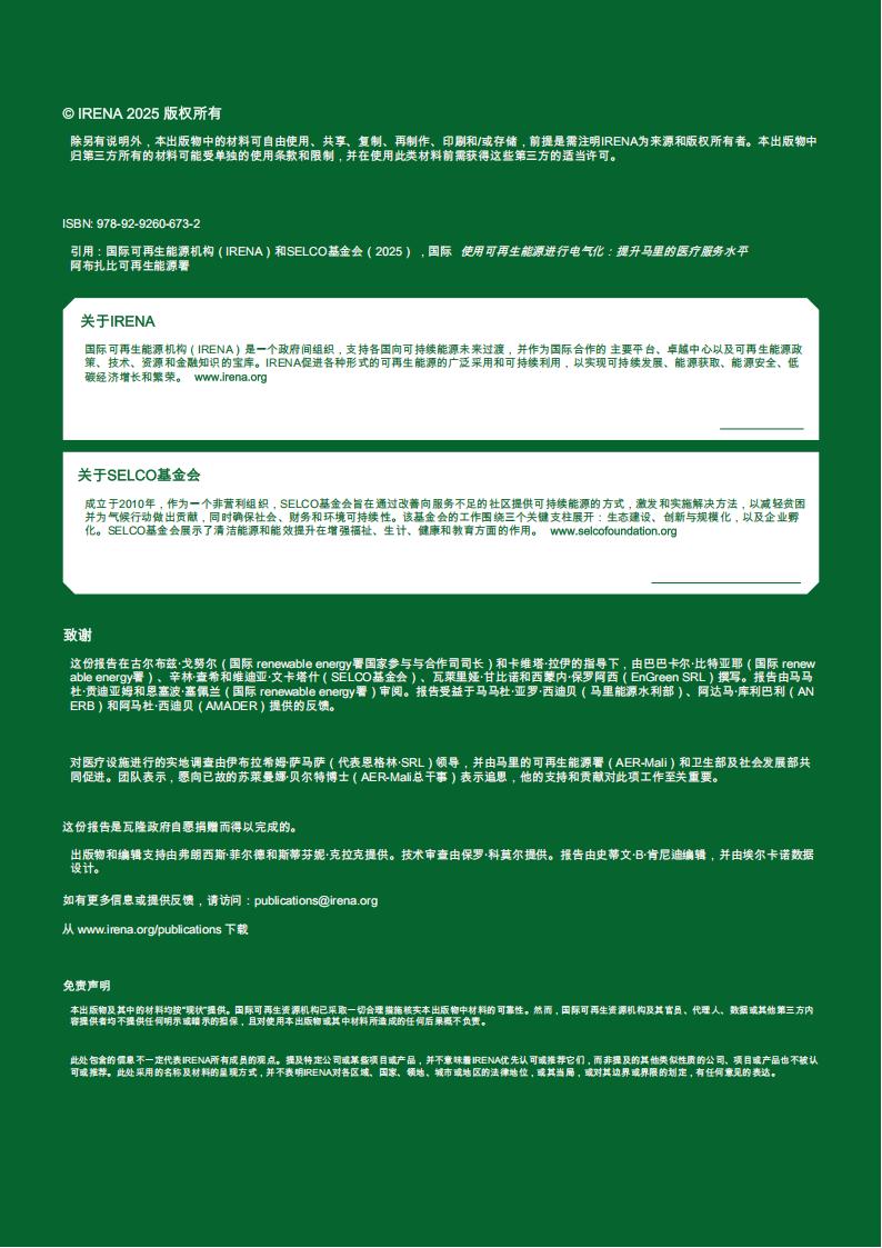 这份报告在古尔布兹·戈努尔(国际renewable energy署国家参与与合作司司长)和卡维塔拉伊的指导下,由巴巴卡尔·比特亚耶(国际renewable energy署)、辛林查希和维迪亚·文卡塔什(SELCO基金会)、瓦莱里娅甘比诺和西蒙内保罗阿西(EnGreen SRL)撰写。报告由马马杜贡迪亚姆和思塞波塞佩兰(国际renewable energy署)审阅。报告受益于马马杜亚罗西迪贝(马里能源水利部)、阿达马·库利巴利(ANERB)和阿马杜西迪贝(AMADER)提供的反馈。