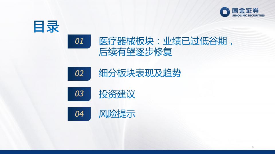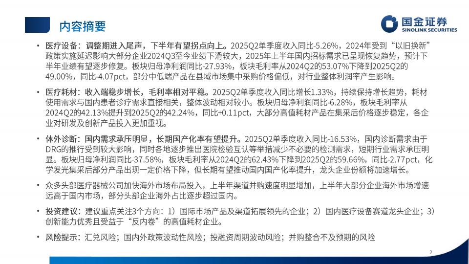 投资建议:建议重点关注3个方向:1)国际市场产品及渠道拓展领先的企业;2)国内医疗设备赛道龙头企业;3)创新能力优秀且受益于“反内卷”的高值耗材企业。