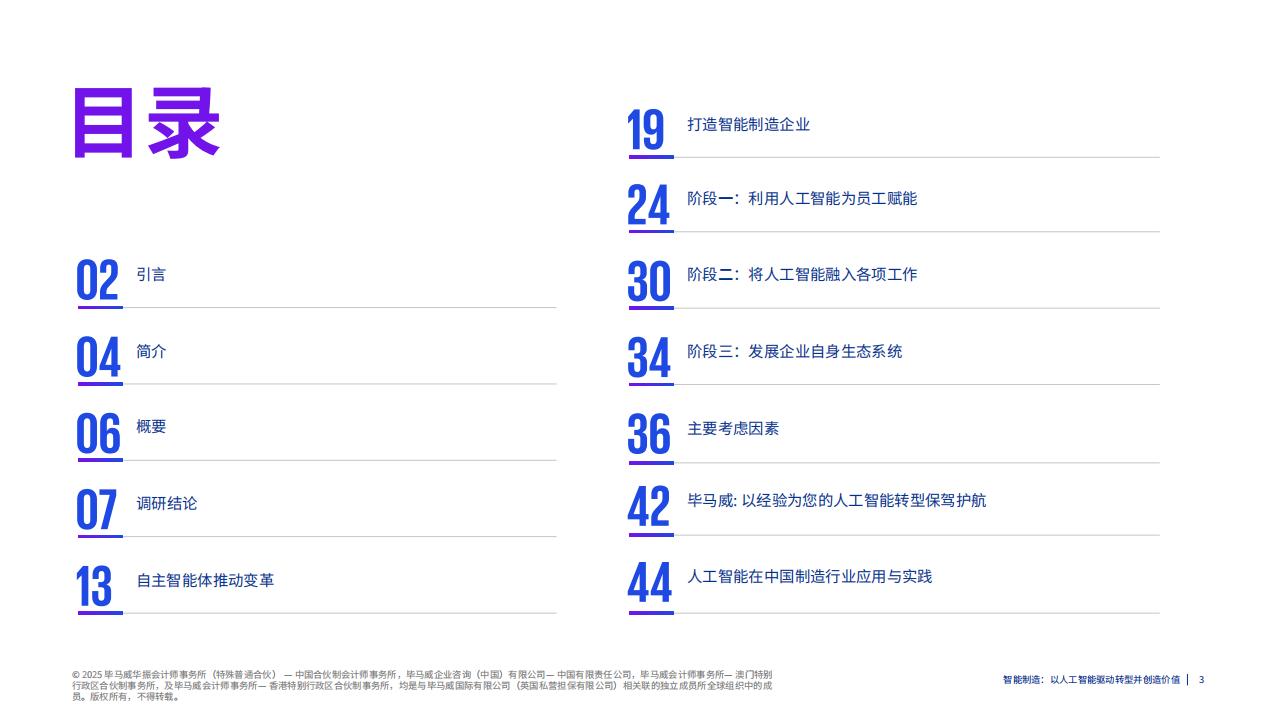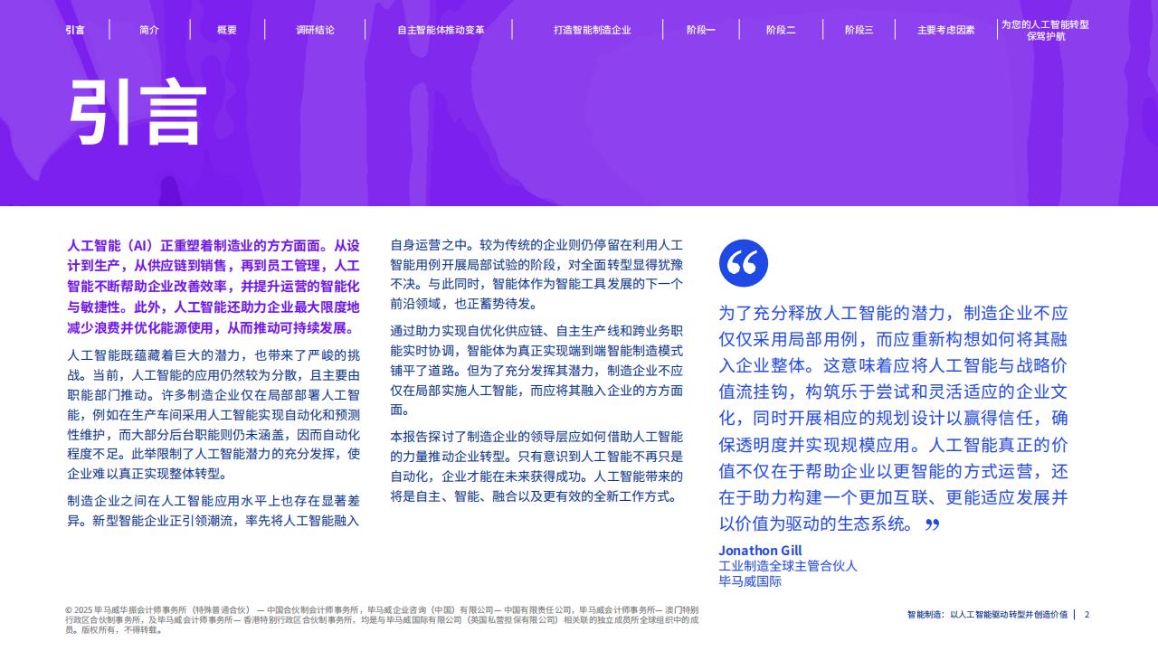 计到生产,从供应链到销售,再到员工管理,人工智能不断帮助企业改善效率,并提升运营的智能化与敏捷性。此外,人工智能还助力企业最大限度地减少浪费并优化能源使用,从而推动可持续发展。人工智能既蕴藏着巨大的潜力,也带来了严峻的挑战。当前,人工智能的应用仍然较为分散,且主要由职能部门推动。许多制造企业仅在局部部署人工智能,例如在生产车间采用人工智能实现自动化和预测性维护,而大部分后台职能则仍未涵盖,因而自动化程度不足。此举限制了人工智能潜力的充分发挥,使企业难以真正实现整体转型。