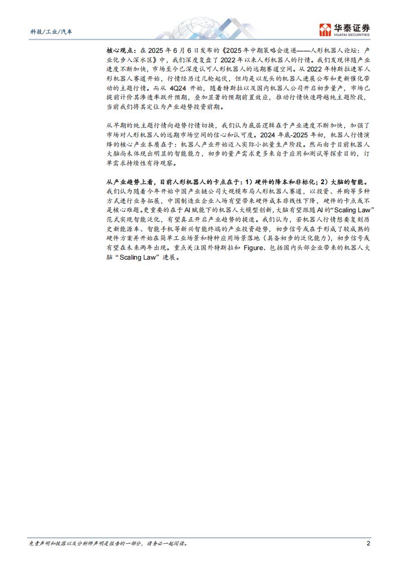 核心观点:在2025年6月6日发布的《2025年中期策略会速递——人形机器人论坛:产业化步入深水区》中,我们深度复盘了2022年以来人形机器人的行情。我们发现伴随产业进度不断加快,市场至今已深度认可人形机器人的远期赛道空间。从2022年特斯拉进军人形机器人赛道开始,行情经历过几轮起伏,但均是以龙头的机器人进展公布和更新催化带动的主题行情。而从4Q24开始,随着特斯拉以及国内机器人公司开启初步量产,市场已提前计价其渗透率跃升预期,叠加显著的预期前置效应,推动行情快速跨越纯主题阶段,当前我们将其定位为产业趋势投资前期。
