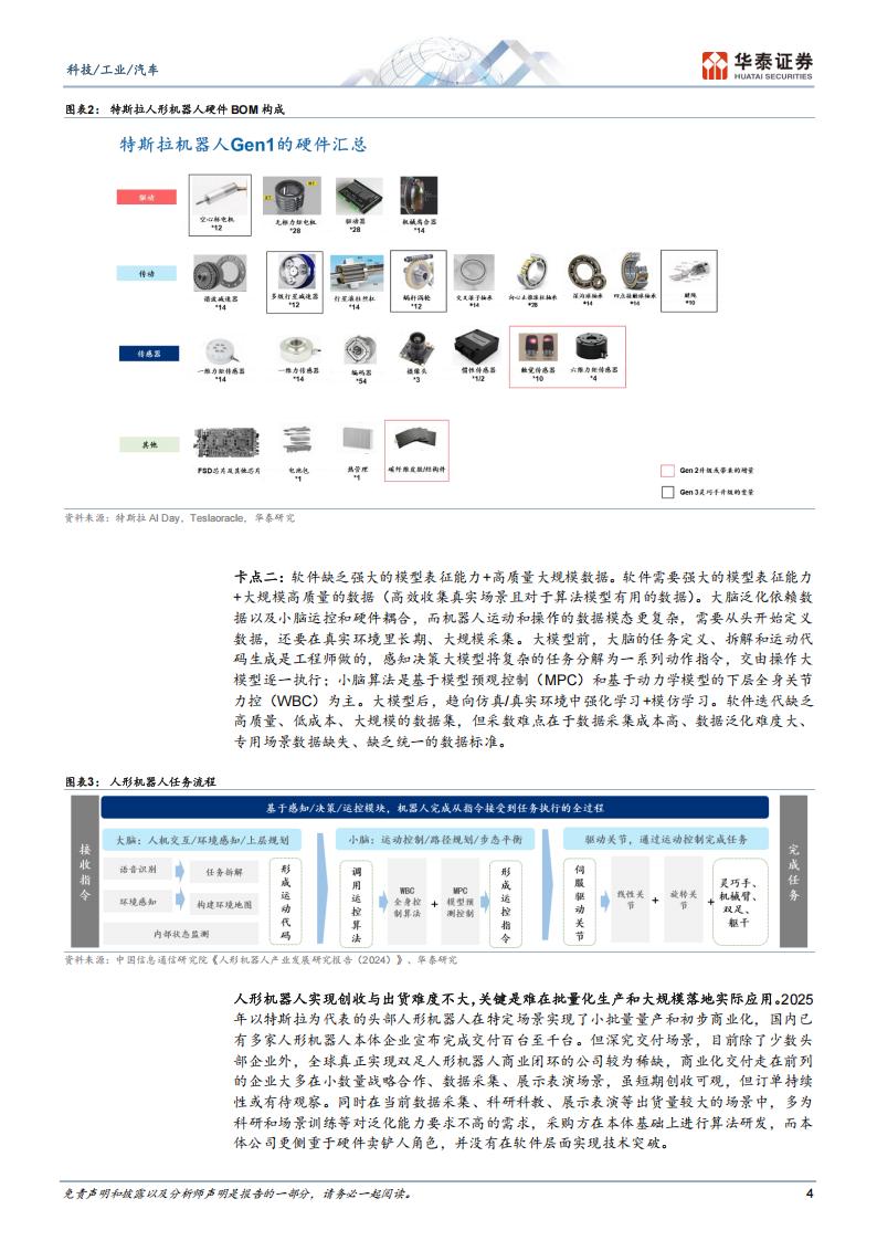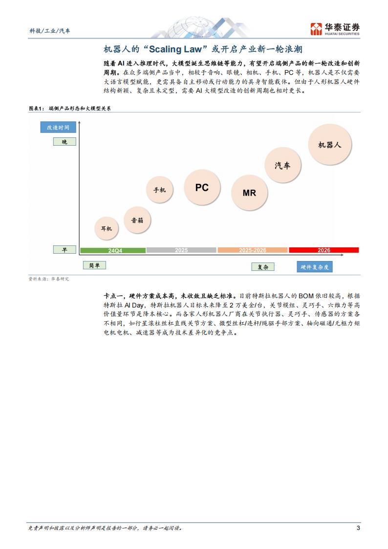 随着AI进入推理时代,大模型诞生思维链等能力,有望开启端侧产品的新一轮改造和创新周期。在众多端侧产品当中,相较于音响、眼镜、相机、手机、PC等,机器人是不仅需要大语言模型赋能,更需具备自主移动或行动能力的具身智能载体。但由于人形机器人硬件结构新颖、复杂且未定型,需要Al大模型改造的创新周期也相对更长。卡点一,硬件方案成本高,未收敛且缺乏标准。目前特斯拉机器人的BOM依旧较高,根据特斯拉AI Day,特斯拉机器人目标未来降至2万美金/台,关节模组、灵巧手、六维力等高价值量环节是降本核心。而各家人形机器人厂商在关节执行器、灵巧手、传感器的方案各不相同,如行星滚柱丝杠直线关节方案、微型丝杠/连杆/绳驱手部方案、轴向磁通/无框力矩电机电机、减速器等成为技术差异化的竞争点。