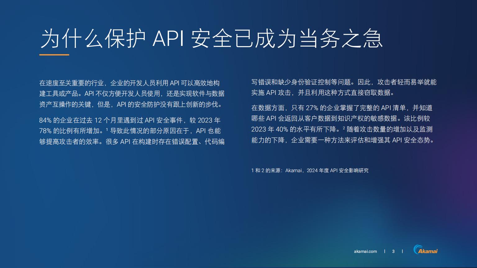 在数据方面,只有27%的企业掌握了完整的API清单,并知道哪些API会返回从客户数据到知识产权的敏感数据。该比例较2023年40%的水平有所下降。2随着攻击数量的增加以及监测能力的下降,企业需要一种方法来评估和增强其API安全态势。