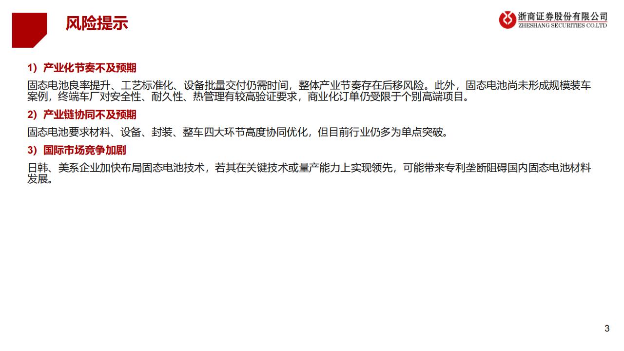 固态电池良率提升、工艺标准化、设备批量交付仍需时间,整体产业节奏存在后移风险。此外,固态电池尚未形成规模装车案例,终端车厂对安全性、耐久性、热管理有较高验证要求,商业化订单仍受限于个别高端项目。