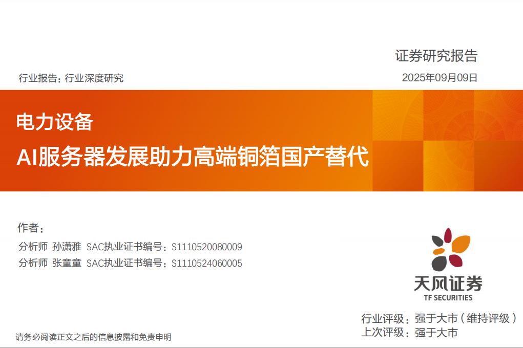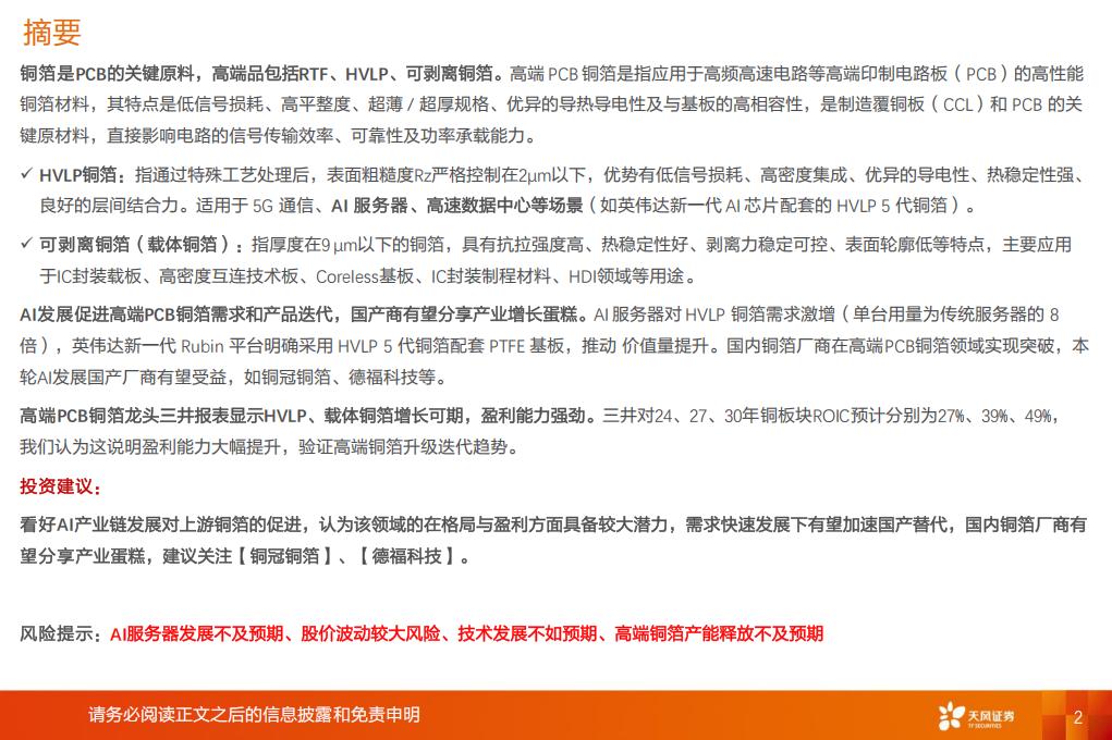 风险提示:Al服务器发展不及预期、股价波动较大风险、技术发展不如预期、高端铜箔产能释放不及预期