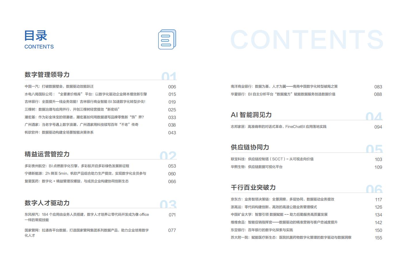 另一方面,企业家要善于利用新一代数智技术工具,让数据治理的效率起到事半功倍的效果。比如,像帆软软件这样专业的大数据BI和分析平台提供商,已经形成非常成熟的数据产品矩阵:报表开发工具FineFeport,数据分析平台FineBI,可视化开发平台FineVis,数据集成平台FneDatalLink,SaaS数据应用工具等。而且,软件厂商为了节约企业的时间,降低使用门槛,往往会基于这些产品封装出来的行业解决方案、业务场景方案、产品组合方案等。前不久,笔者去广东佛山一家已经是细分行业头部玩家的大型电子制造业企业调研。看到该企业还是由“表哥”、“表姐”使用exce表格来作数据收集和分析时,深感中国制造业所使用的ICT工具尚处于非常原始的状态。于是我现场让她们搜索井打开FineBI,当我用一分钟简略地介缩这个工具能怎么解放“表哥”“表姐”时,该企业董事长大吃一惊。他说完全不了解有这样的数智技术工具。人类发展史,就是一部工具迭代的史诗!现代人与2500年前的孔子在大膨结构和功能上几乎没有差别,但现代人的能力水平远胜于孔子时代的能力水平,原因就是现代人会使用很多新工具。但是,需要有危机感的是:人选择工具,工具也在选择人!当企业家对新一代数智技术工具没有好奇心,而坚持用自己最熟恶的工具来完成工作时,就像你从北京到深圳,放弃飞机和高铁这样的交通工具,坚持骑自行车走完全程—井非不可以,而是没有必要当这样的苦行惜。笔者观察到当今那些行业领先企业。比加京东方、天虹、徐工、欧报、东吴证券等,无一例外,都是非常善于利用新一代数智技术工具的先锋。