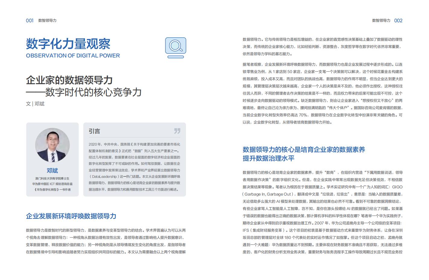 数据领导力的核心是培育企业家的数据素养,提升“数商”,在组织内营造“下属用数据说话,领导者用数据作决策的数字组织文化。但是,在企业实践中常常出现数据充足但决策低效,不相信数据块策结果等现象。笔者认为相因在于数据质量上。学术实证研究中有一个广为人知的词汇:GIGO(Garbage h,Garbage Out),翻译成中文是“垃圾进,垃圾出”,意思是:当输入的数据质量差。无论惜助多么强大的AI模型来处理数据,其输出的结果也必然不可靠。看到不可靠的数据洞察结论,有些企业家驾人工智能是人工智障,岂不知,是你在源头投喂给AI的数据就已经出了问题。如果基于错误的数据也能得出正确的数据决策,那计算机学科的科学性体现在哪?笔者举一个华为实践例子,期待企业家从中得到启示重视数据治理工作。2007年,华为公司孟晚舟主导一个公司级的变革项目:IFS(集成财经服务变革)。这个项目的初衷是基于数据题动方式来重塑华为财务体系,让身在深圳坂田总部的管理层对全球180个代表处的实时运作情况了如指掌。但这个项目启动之初,孟晚舟就遇到一个大难题:华为数据质量达不到预期。主要体现在财务数据不准确且不易获取,无法通过多维度的、客户化的财务分析支持业务决策,重要财务与账务流程手工操作导致周期过长且不规范业务控制、政策、流程与授权规范性差等等。于是,华为决定同步启动数据治理工作,这个动作持续惯穿于IFS项目全过程,从2007年开始一直到2014年1FS项目关闭。8年时间的双难推动,才获得如今华为公司较高质量的数据。2023年4月孟晚舟首次担任华为公司轮值董事长,在首次公众演讲中分享了华为数字化转型的经验,特别强调一个观点:“数据治理”是数字化转型的基础。从华为实践中我们可以得到一个启示:在战略决策中平衡“数据洞察”与“企业家直觉”,关键在于数据河察能够真实反映经营管理的实际,而背后得在数据质量上作文章,通过数据治理,实现数据清洁,建立有效的数据质量度量改进机制。之后才是通过建设数据中台,推动数据服务化,支撑数字化转型。