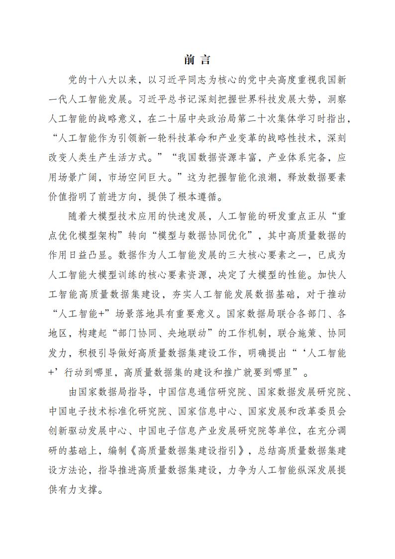 由国家数据局指导,中国信息通信研究院、国家数据发展研究院、中国电子技术标准化研究院、国家信息中心、国家发展和改革委员会创新驱动发展中心、中国电子信息产业发展研究院等单位,在充分调研的基础上,编制《高质量数据集建设指引》,总结高质量数据集建设方法论,指导推进高质量数据集建设,力争为人工智能纵深发展提供有力支撑。