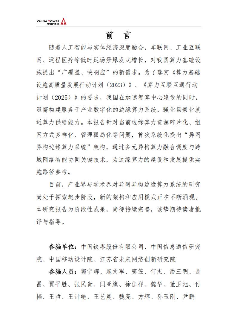 随着人工智能与实体经济深度融合,车联网、工业互联网、远程医疗等低时延场景爆发式增长,对我国算力基础诊施提出“广覆盖、快响应”的新需求。为了落实《算力基设施高质量发展行动计划(2023)》、《算力互联互通行动计划(2025)》的要求,我国在加速智算中心建设的同时,亟需构建服务于产业数字化的边缘算力系统,强化场景化京近算力供给能力。本报告针对当前边缘算力资源碎片化、网方式多样化、管理孤岛化等问题,首次系统化提出“异网异构边缘算力系统”架构,通过多元异构算力融合调度与路域网络智能协同关键技术,为边缘算力的建设和发展提供实施路径参考。