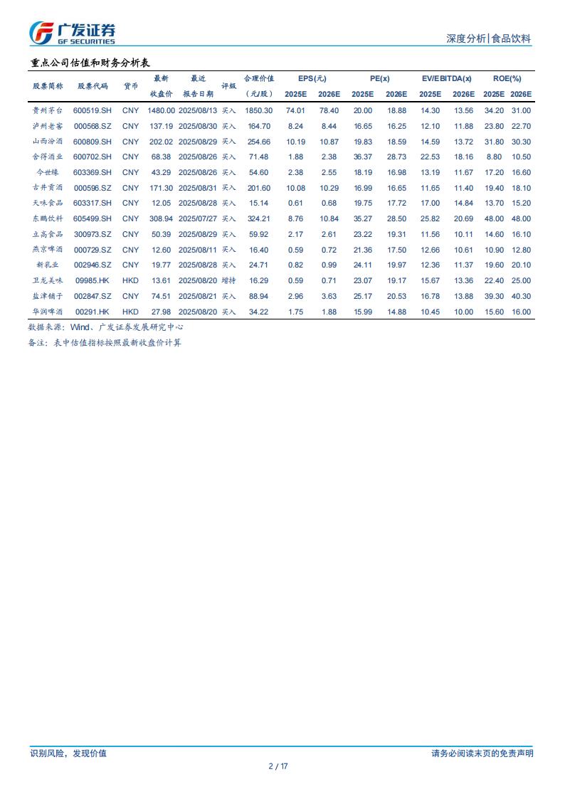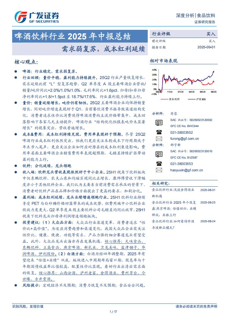 价比+高价值”。为适应消费趋势和渠道变化,我国大众品企业需关注性价比、健康、便捷、功能等需求,产品力强的细分赛道龙头有望受益。此外,大众品龙头出海亦存在发展机遇,核心推荐:天味食品、东鹏饮料、立高食品、燕京啤酒、新乳业、卫龙美味、盐津铺子、华润啤酒、伊利股份。(2)白酒方面:白酒历经四年调整期,2025年有望迎来“估值+业绩”双底,板块进入中周期布局窗口期,股息率与十年期国债收益率比值较高,配置性价比显现。看好行业出清后需求面的恢复。核心推荐:山西汾酒、泸州老窖、舍得酒业、贵州茅台、今世缘、古井贡酒。