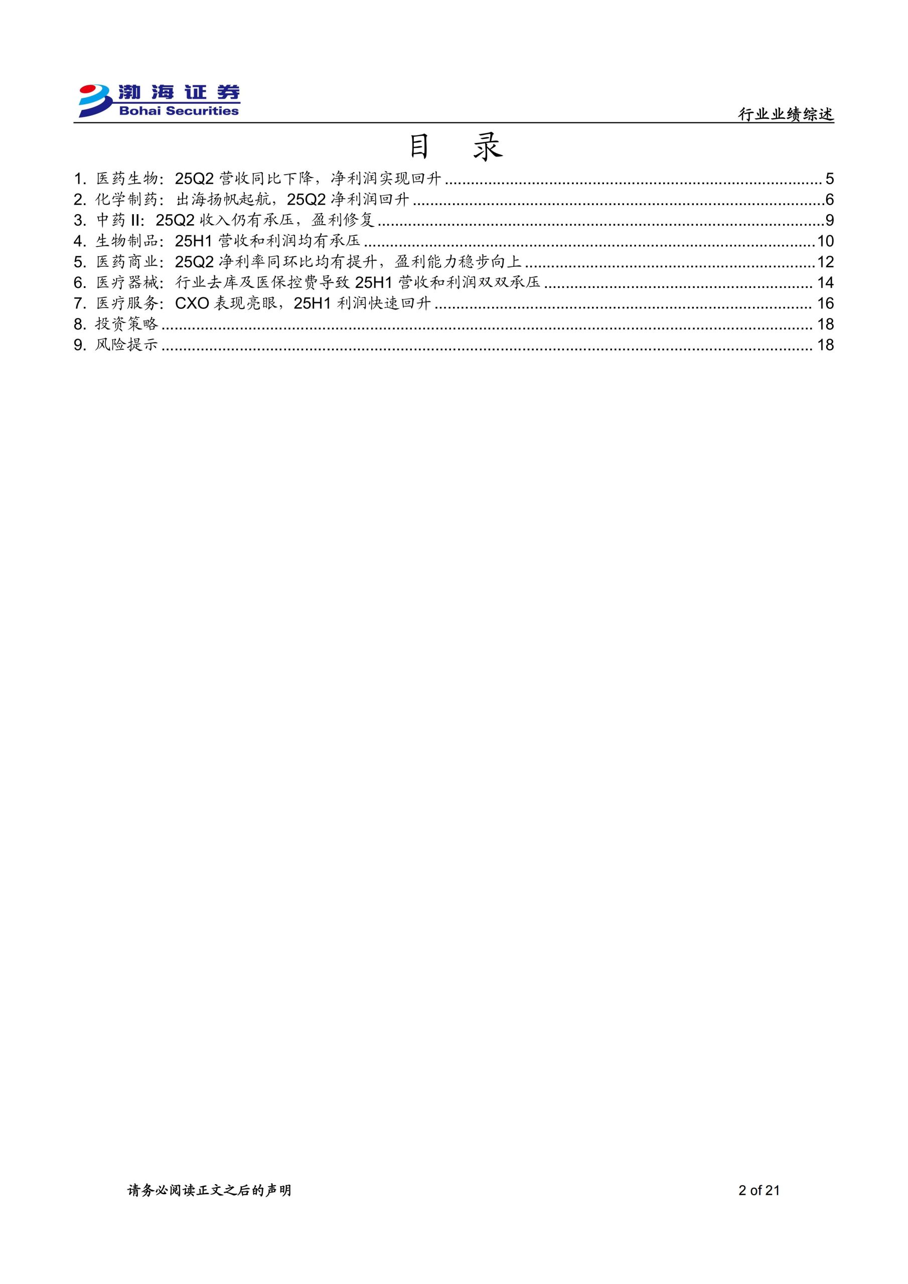 25H1医药生物行业营收和归母净利润同比均有所下降,25Q2营收同比下降、净利润实现回升,25Q2净利率同环比均有改善。1)化学制药:25Q2实现营业收入1,369.35亿元,同比下降1.4%,25Q2实现归母净利润133.06亿元,同比增长9.0%,第二季度盈利回升明显,25Q2毛利率和净利率显著提升。新药研发带动25H1研发费用率同比提升,销售费用投入有所加大。出海扬帆起航,BD营收贡献增量。2)中药II:25Q2实现营业收入857.55亿元,同比下降2.1%,25Q2实现归母净利润101.35亿元,同比增长6.4%,盈利能力有所回升。25H1研发力度略有收缩,销售费用费效比提升。3)生物制品:25Q2实现营业收入297.74亿元,同比下降10.4%,25Q2实现归母净利润31.56亿元,同比下降25.3%,营收和利润均有承压,主要系血制品和疫苗板块高基数、需求承压和竞争加剧的影响,目前行业仍处于去库阶段。上半年研发与销售费用均加大投放。4)医药商业:25Q2实现营业收入2,547.59亿元,同比增长0.9%,25Q2实现归母净利润64.02亿元,同比增长19.5%,25Q2净利率同环比均有提升,盈利能力稳步向上。5)医疗器械:25Q2实现营业收入613.08亿元,同比下降4.8%,25Q2实现归母净利润92.60亿元,同比下降23.7%。受到行业去库持续及医保控费的影响,医疗器械行业上半年营收和利润双双承压,仍处于修复进程中。6)医疗服务:25Q2实现营业收入458.52亿元,同比增长3.2%,25Q2实现归母净利润79.60亿元,同比增长32.6%。医疗服务板块为25H1医药生物行业细分板块中收入和利润增速最快的板块,主要系CXO行业筑底反弹,在手订单表现亮眼,贡献主要增量。