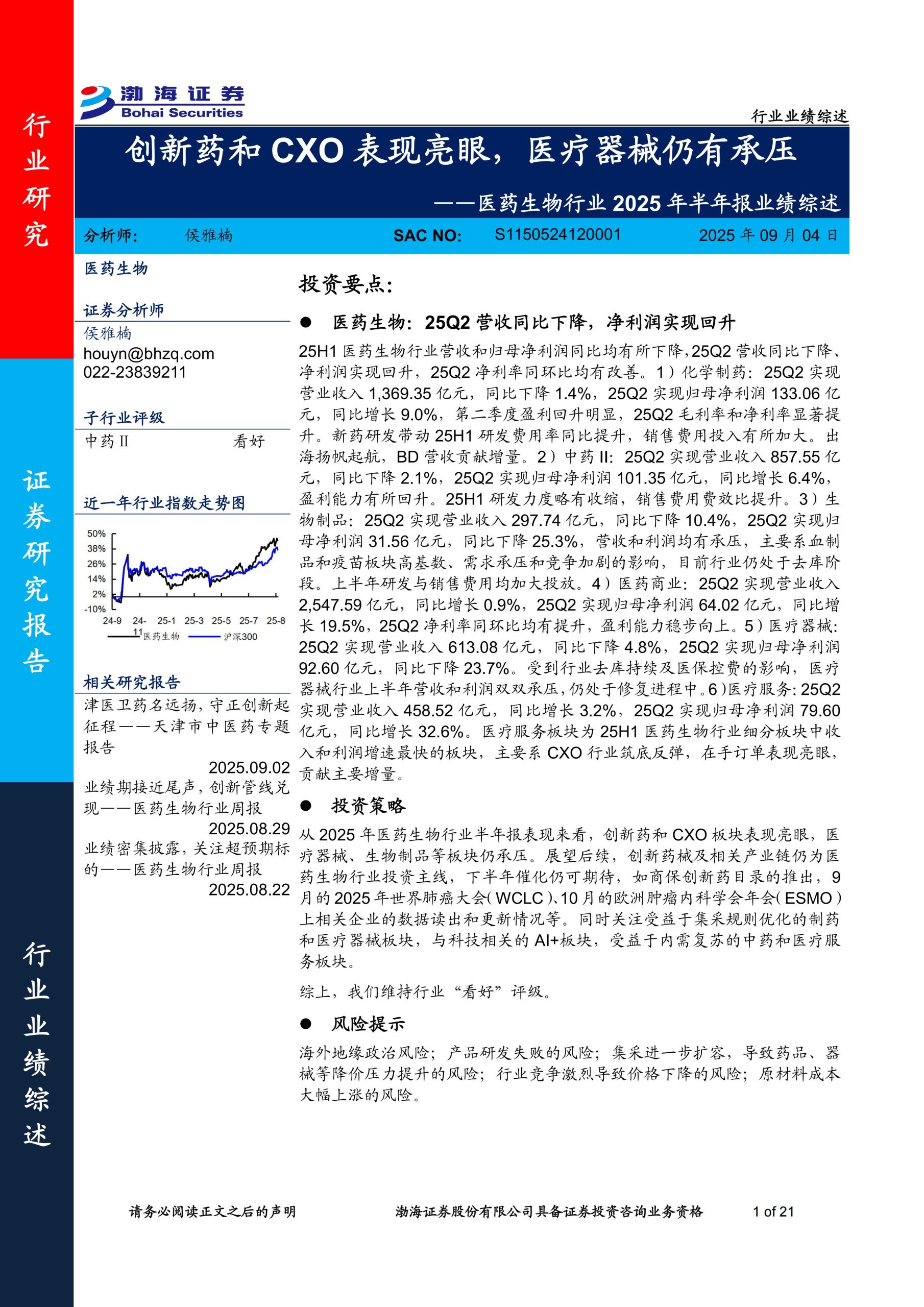●医药生物:25Q2营收同比下降,净利润实现回升