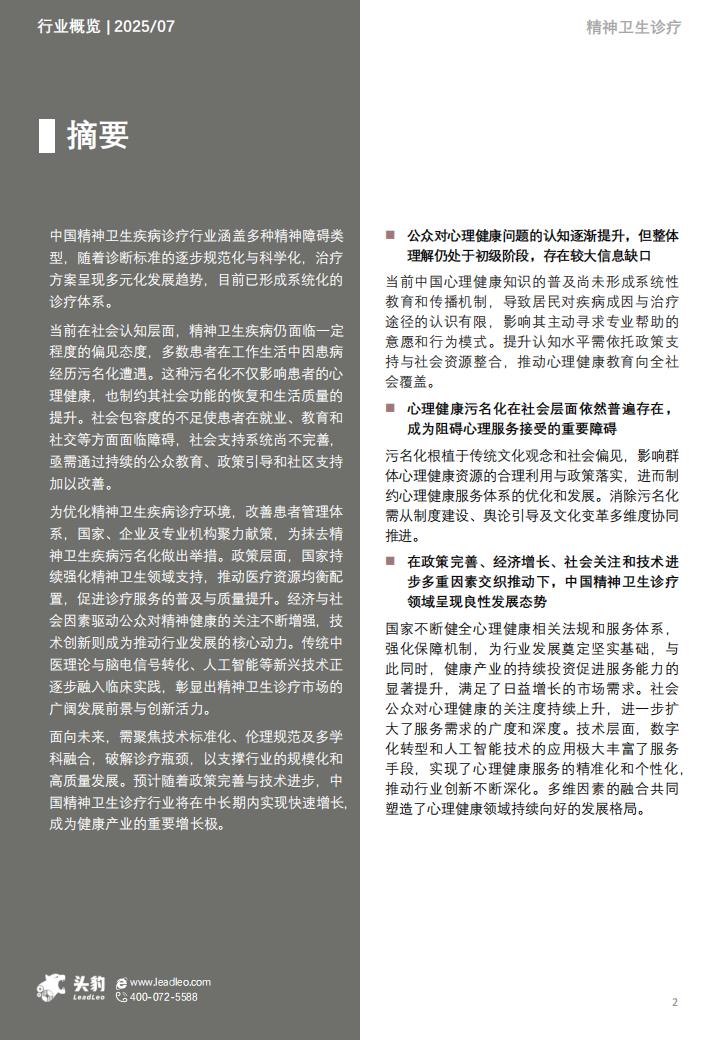 面向未来,需聚焦技术标准化、伦理规范及多学科融合,破解诊疗瓶颈,以支撑行业的规模化和高质量发展。预计随着政策完善与技术进步,中国精神卫生诊疗行业将在中长期内实现快速增长,成为健康产业的重要增长极。
