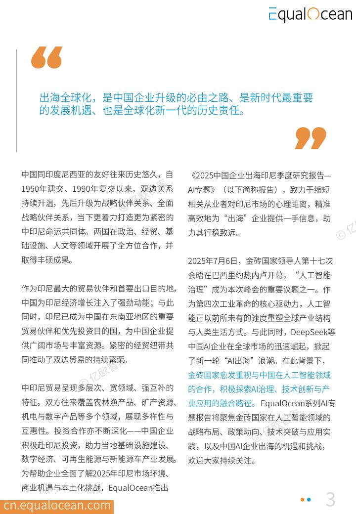 中印尼贸易呈现多层次、宽领域、强互补的特征。双方往来覆盖农林渔产品、矿产资源、机电与数字产品等多个领域,展现多样性与互惠性。投资合作亦不断深化——中国企业积极赴印尼投资,助力当地基础设施建设、数字经济、可再生能源与新能源车产业发展。为帮助企业全面了解2025年印尼市场环境、商业机遇与本土化挑战,EqualOcean推出《2025中国企业出海印尼季度研究报告一Al专题》(以下简称报告),致力于缩短相关从业者对印尼市场的心理距离,精准高效地为“出海”企业提供一手信息,助力其行稳致远。