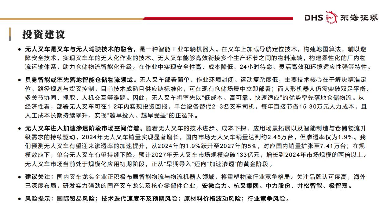 级需求的持续驱动,2024年无人叉车销量实现显著增长,国内市场无人叉车销量达到约2.45万台,但渗透率仅为1.9%。我们预测无人叉车有望迎来渗透率的加速提升,从2024年的1.9%跃升至2027年的5%,对应国内销量扩张至7.41万台;在规模效应下,单台无人叉车有望持续下降。预计2027年无人叉车市场规模突破133亿元,增长到2024年市场规模的两倍以上。无人叉车市场当前处于规模化应用初期阶段,正从“早期导入”迈向“加速渗透”的黄金阶段。