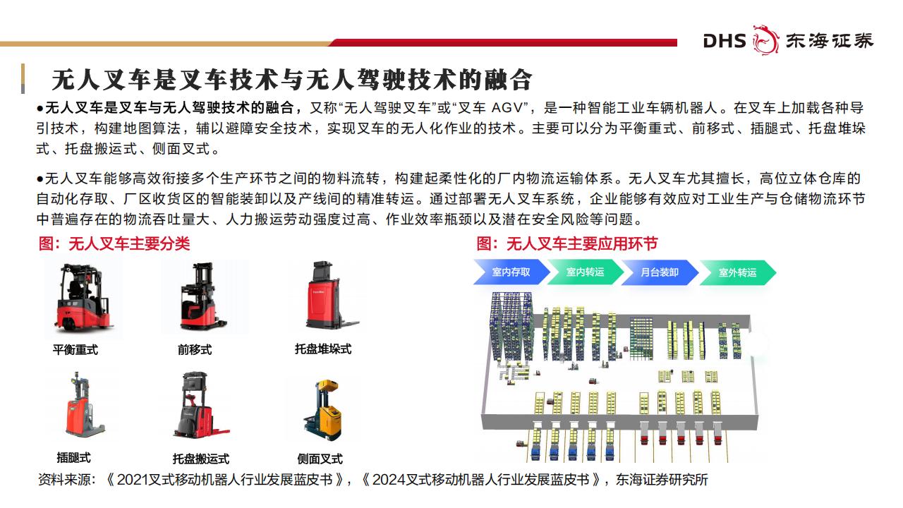 ●具身智能或率先落地智能仓储物流领域。无人叉车部署简单、作业环境封闭、运动复杂度低,主要技术核心在于解决精准定