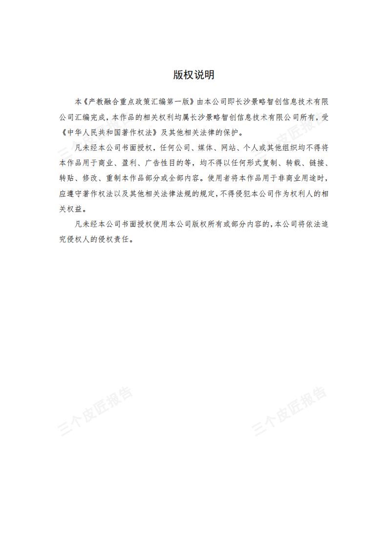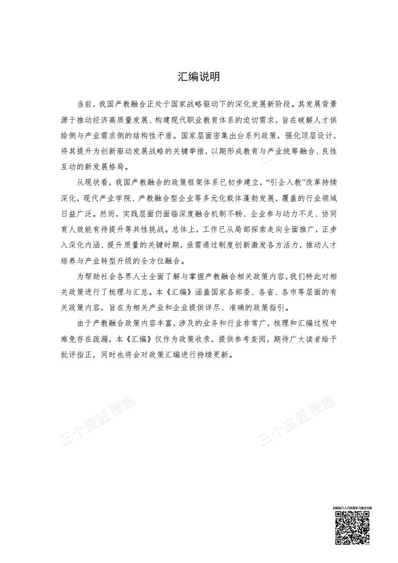 由于产教融合政策内容丰富,涉及的业务和行业非常广,梳理和汇编过程中难免存在疏漏,本《汇编》仅作为政策收录,提供参考查阅,期待广大读者给予批评指正,同时也将会对政策汇编进行持续更新。