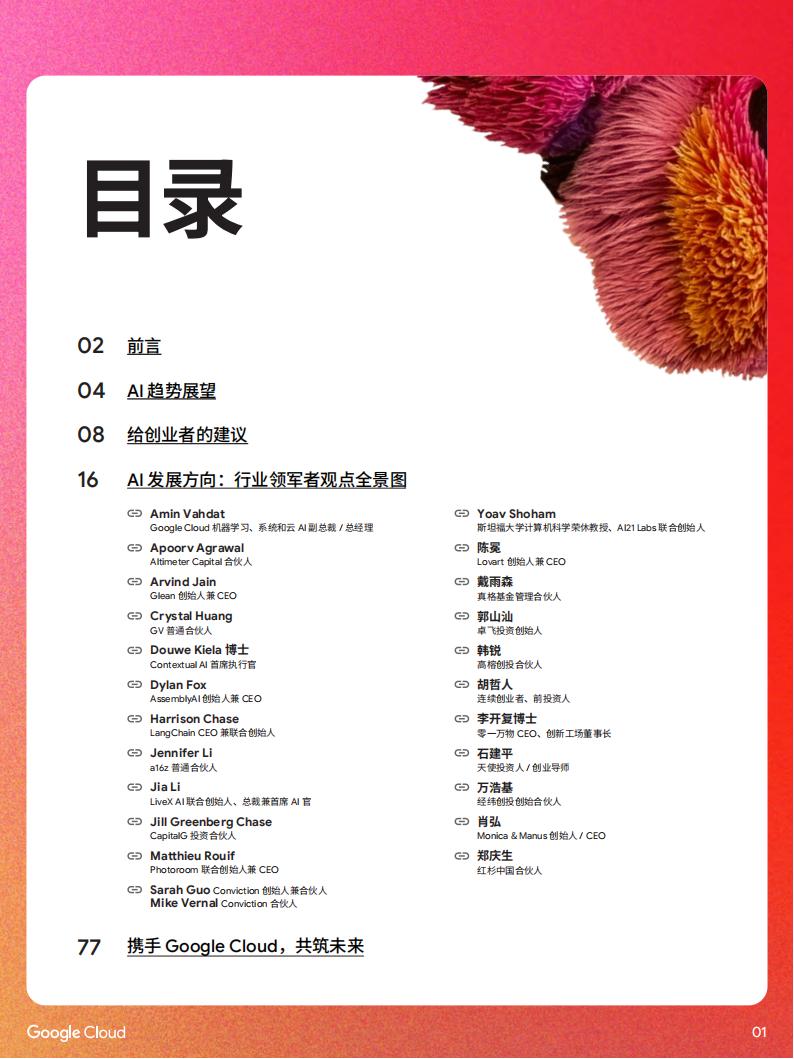 本报告汇集了行业内众多思想领袖对AI未来趋势的深刻洞察,并为初创公司提供了宝贵的建议。我们希望这些观点能启发您,助您在AI时代把握机遇,乘势而上,共同开启智能未来。