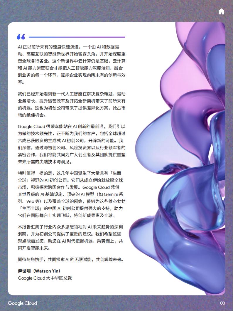 AI正在重塑世界各地的组织,为解决复杂难题、驱动增长、提高效率及开拓全新商机带来前所未有的机遇。初创公司尤其如此,他们正快速行动,借助AI抢占新兴市场机遇。Google Cloud处于AI创新的枢纽,我们以技术领先为傲,不断为客户开辟全新可能,其中包括全球六成以上已获融资的生成式AI初创公司。我们热切期待与初创公司、风险投资界及行业领军者合作,共同为创业者及其团队提供重塑未来所需的尖端技术。AI正以前所未有的速度快速演进,一个由AI和数据驱动、高度互联的智能新世界开始崭露头角,并开始深度重塑全球各行各业。这个新世界中云计算仍是基础,云计算和AI能力紧密联合才能把人工智能能力深度浸润、融合到业务的每一个环节,赋能企业实现前所未有的创新与效率。