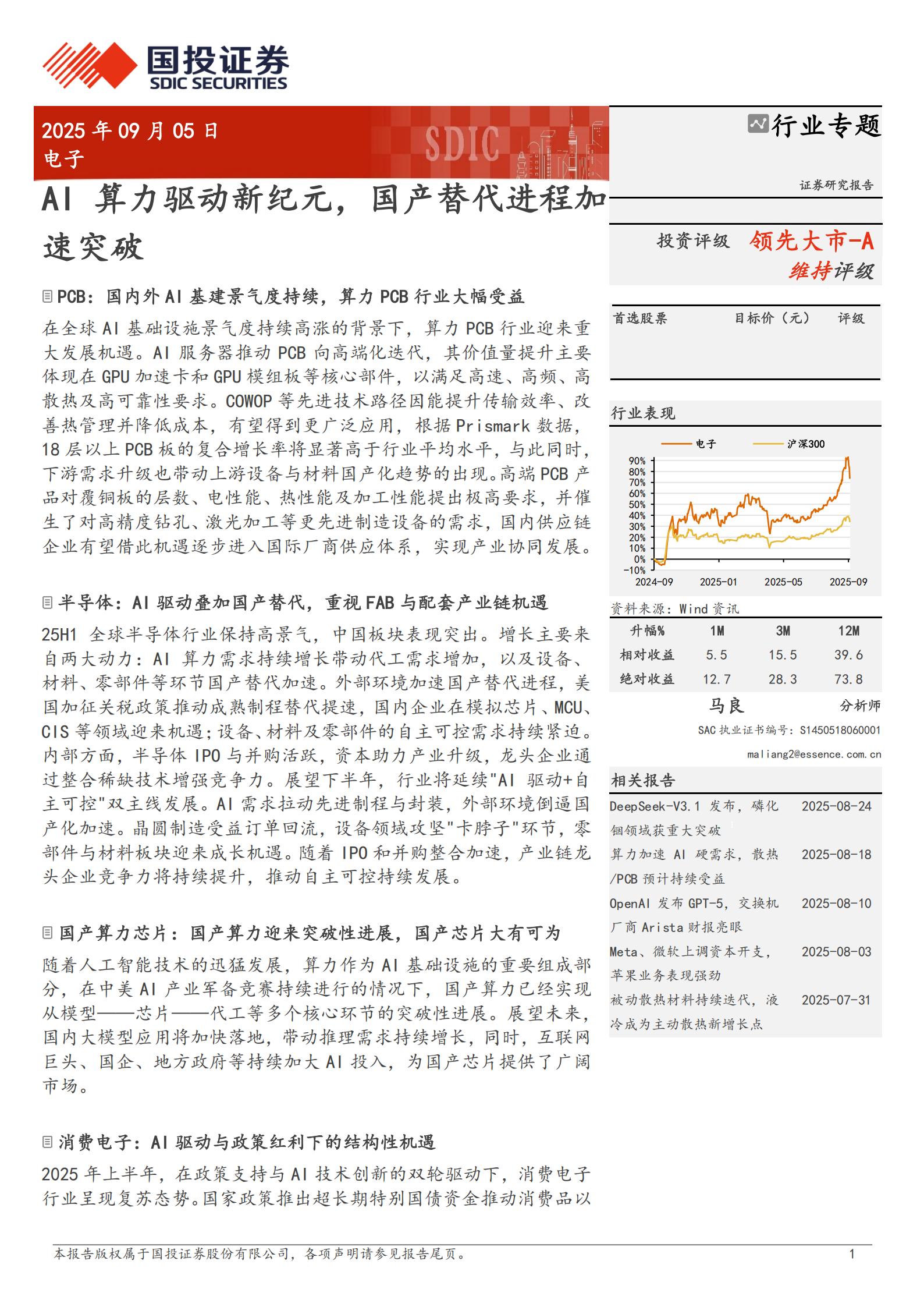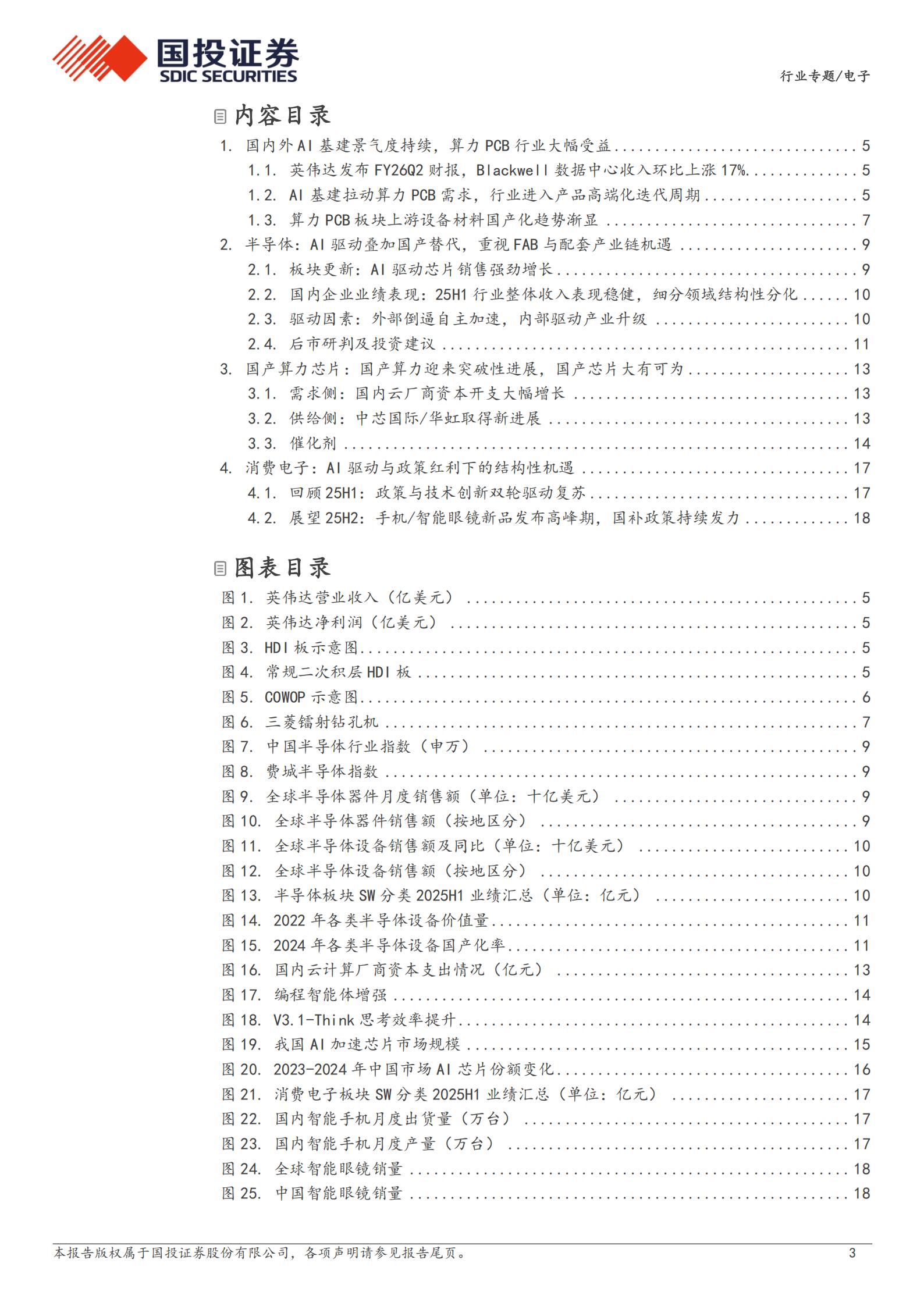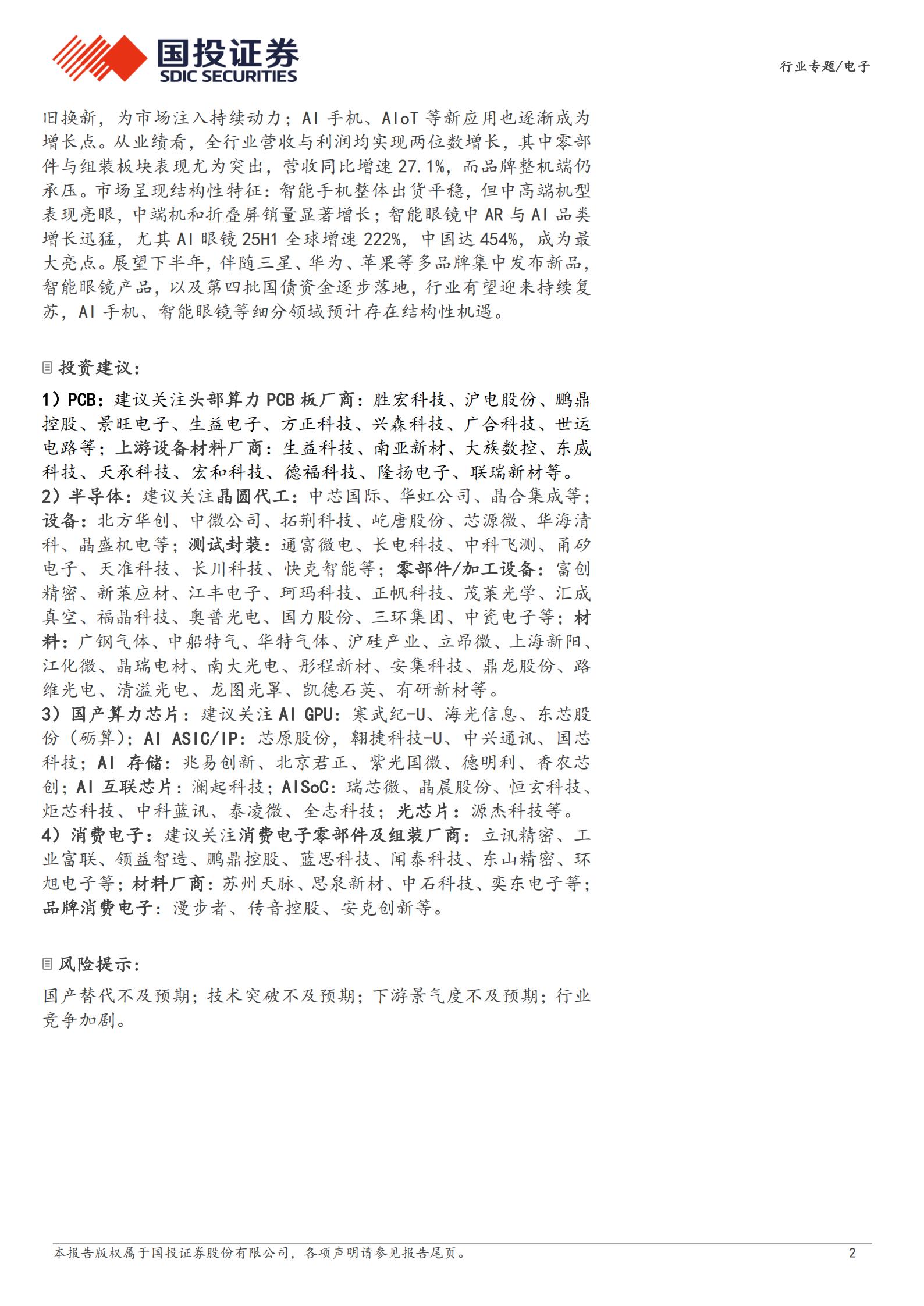 25H1全球半导体行业保持高景气,中国板块表现突出。增长主要来自两大动力:Al算力需求持续增长带动代工需求增加,以及设备、材料、零部件等环节国产替代加速。外部环境加速国产替代进程,美国加征关税政策推动成熟制程替代提速,国内企业在模拟芯片、MCU、CIS等领域迎来机遇;设备、材料及零部件的自主可控需求持续紧迫。内部方面,半导体IPO与并购活跃,资本助力产业升级,龙头企业通过整合稀缺技术增强竞争力。展望下半年,行业将延续”AI驱动+自主可控”双主线发展。Al需求拉动先进制程与封装,外部环境倒逼国产化加速。晶圆制造受益订单回流,设备领域攻坚”卡脖子”环节,零部件与材料板块迎来成长机遇。随着IPO和并购整合加速,产业链龙头企业竞争力将持续提升,推动自主可控持续发展。