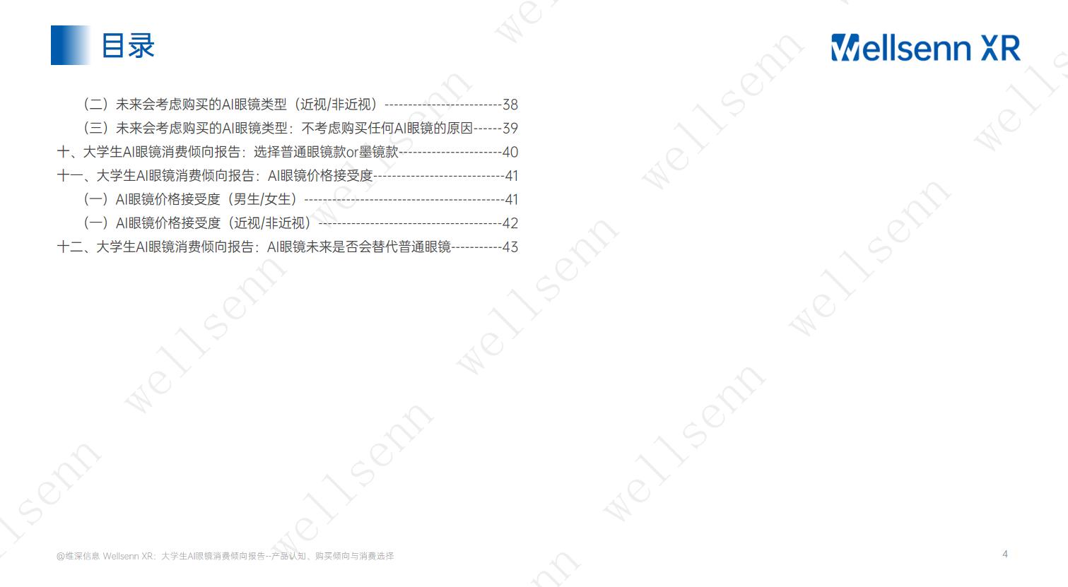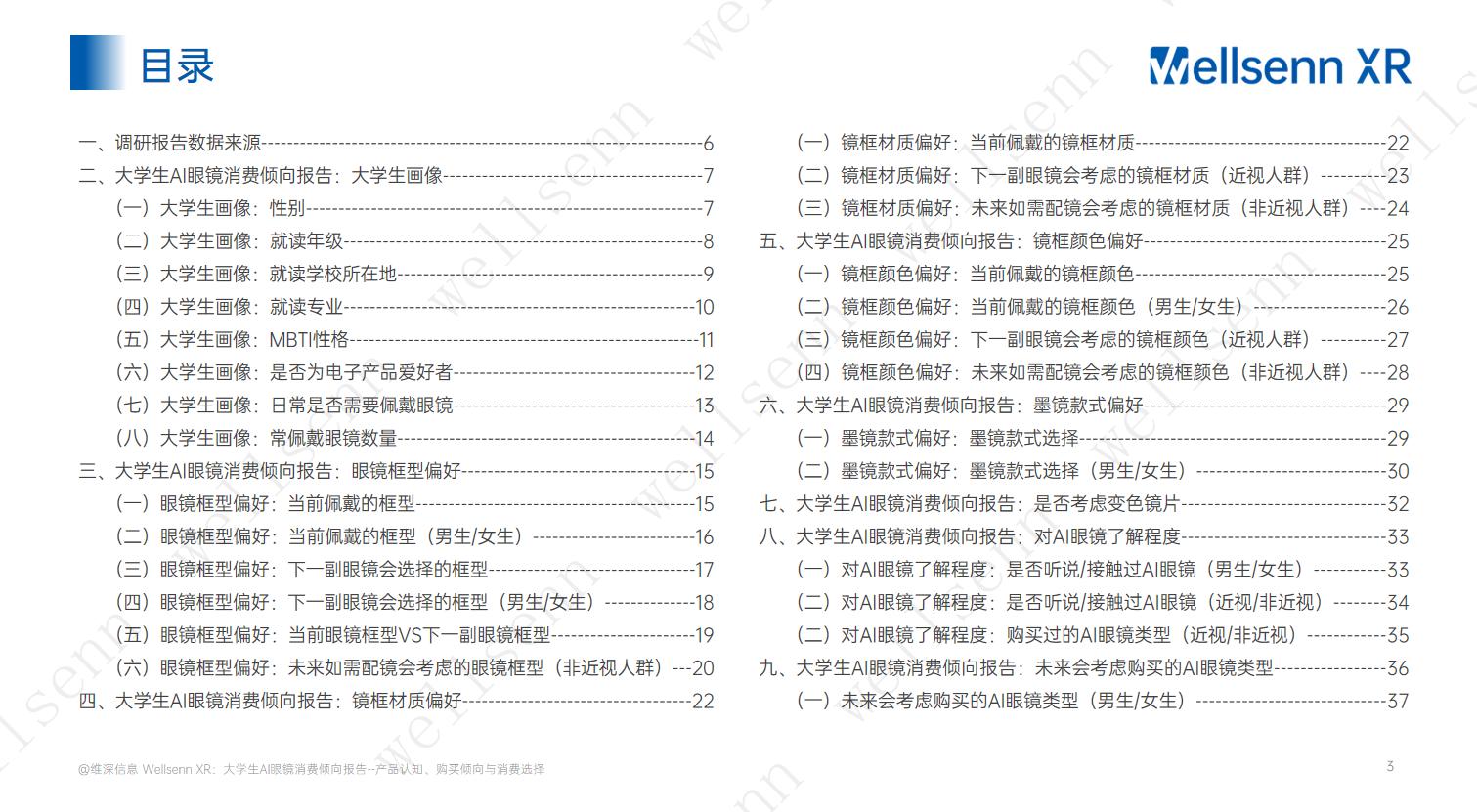 本报告会员完整版共44页,聚焦男/女大学生群体对Al眼镜的了解程度,对普通眼镜/墨镜的款式、框形、颜色、材质的偏好(提供实例眼镜框型供用户参考选择),不同功能AI眼镜购买倾向,价格接受度,对Al眼镜未来替代普通眼镜是否乐观等方面。完整版报告请付费购买或加入维深会员查看。
