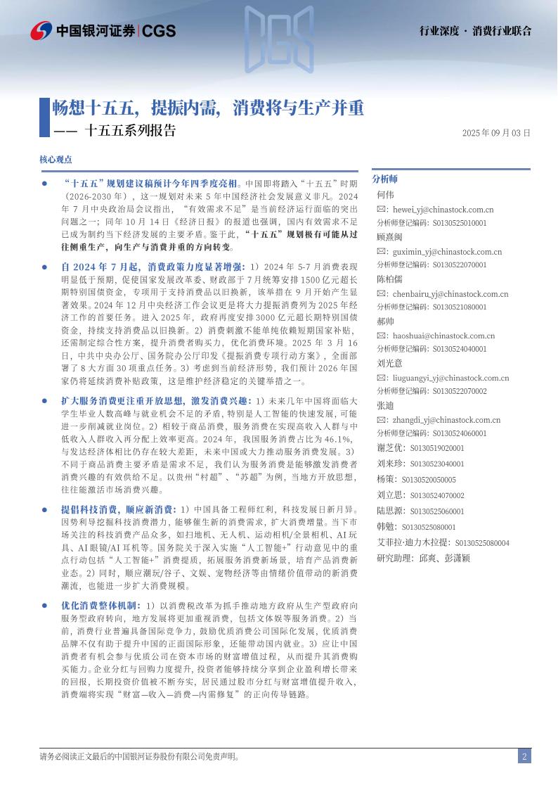 “十五五”规划建议稿预计今年四季度亮相。中国即将踏入“十五五”时期(2026-2030年),这一规划对未来5年中国经济社会发展意义非凡。2024年7月中央政治局会议指出,“有效需求不足”是当前经济运行面临的突出问题之一;同年10月14日《经济日报》的报道也强调,国内有效需求不足已成为制约当下经济发展的主要矛盾。鉴于此,“十五五”规划极有可能从过往侧重生产,向生产与消费并重的方向转变。