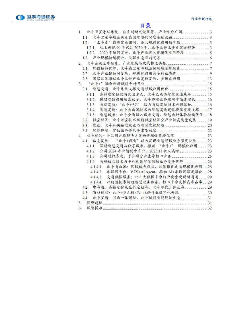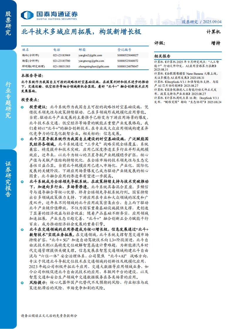 o投资建议:北斗系统作为我国自主可控的战略性时空基础设施,凭借技术领先性与政策持续驱动,已在多领域形成规模化应用势能。当前,驱动北斗产业发展的主要推手已转变为下游应用场景的爆发,北斗技术在交通、低空经济等场景的赋能正重塑产业发展格局。我们看好以“北斗+”的融合创新技术,在专业或大众应用领域构建差异化竞争力的信息化数智企业。相关标的:信息发展。