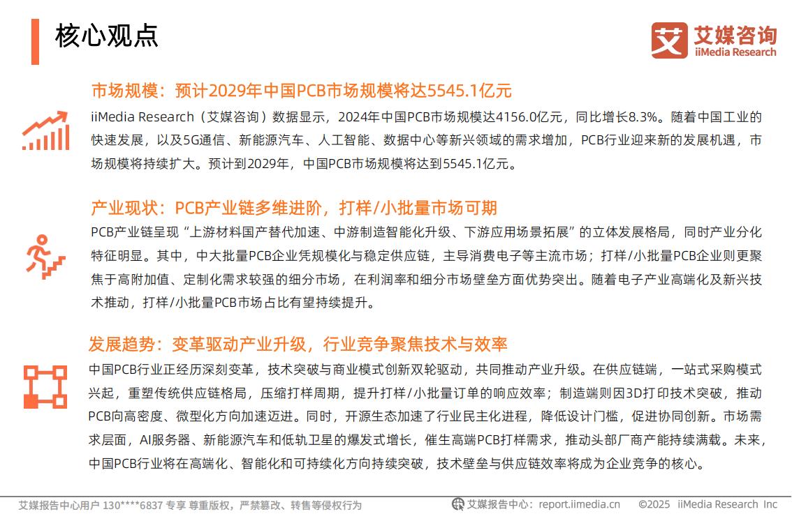 iiMedia Research(艾媒咨询)数据显示,2024年中国PCB市场规模达4156.0亿元,同比增长8.3%。随着中国工业的快速发展,以及5G通信、新能源汽车、人工智能、数据中心等新兴领域的需求增加,PCB行业迎来新的发展机遇,市场规模将持续扩大。预计到2029年,中国PCB市场规模将达到5545.1亿元。