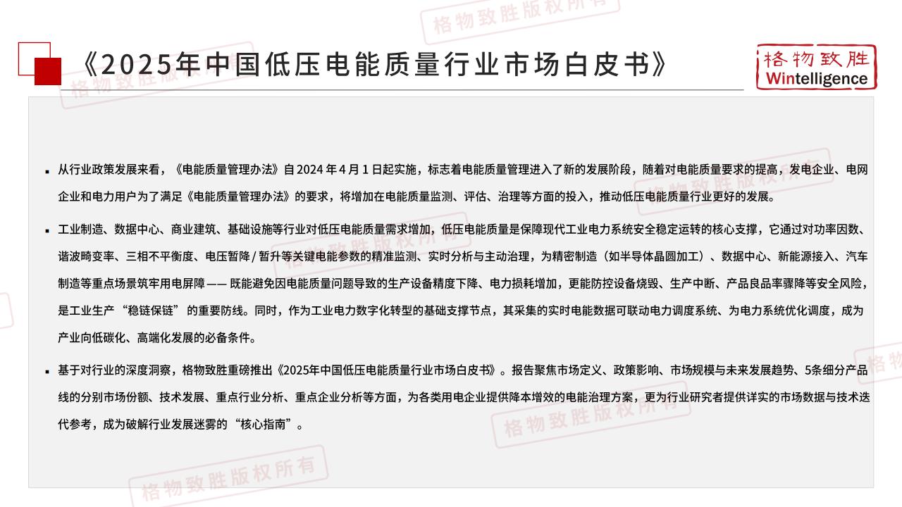基于对行业的深度洞察,格物致胜重磅推出《2025年中国低压电能质量行业市场白皮书》。报告聚焦市场定义、政策影响、市场规模与未来发展趋势、5条细分产品线的分别市场份额、技术发展、重点行业分析、重点企业分析等方面,为各类用电企业提供降本增效的电能治理方案,更为行业研究者提供详实的市场数据与技术迭代参考,成为破解行业发展迷雾的“核心指南”。