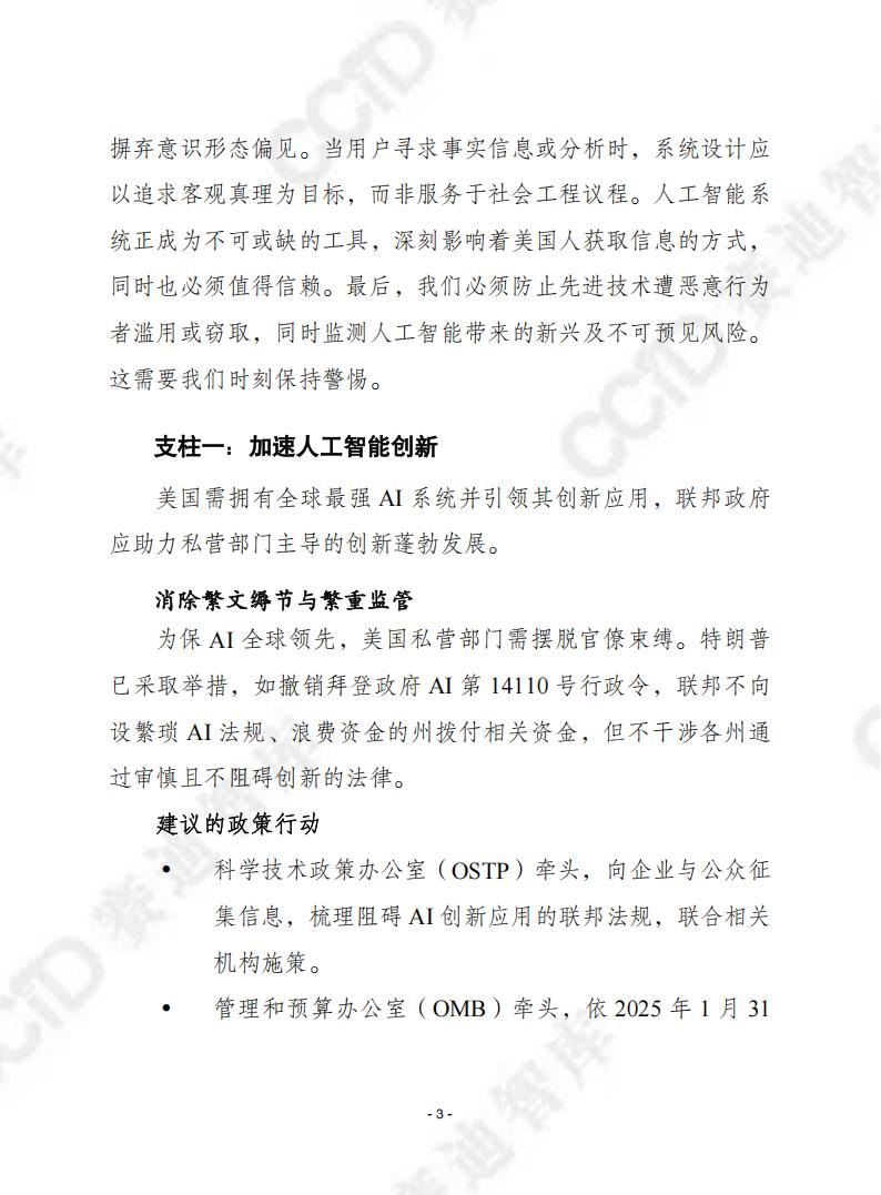 美国需拥有全球最强AI系统并引领其创新应用,联邦政府应助力私营部门主导的创新蓬勃发展。