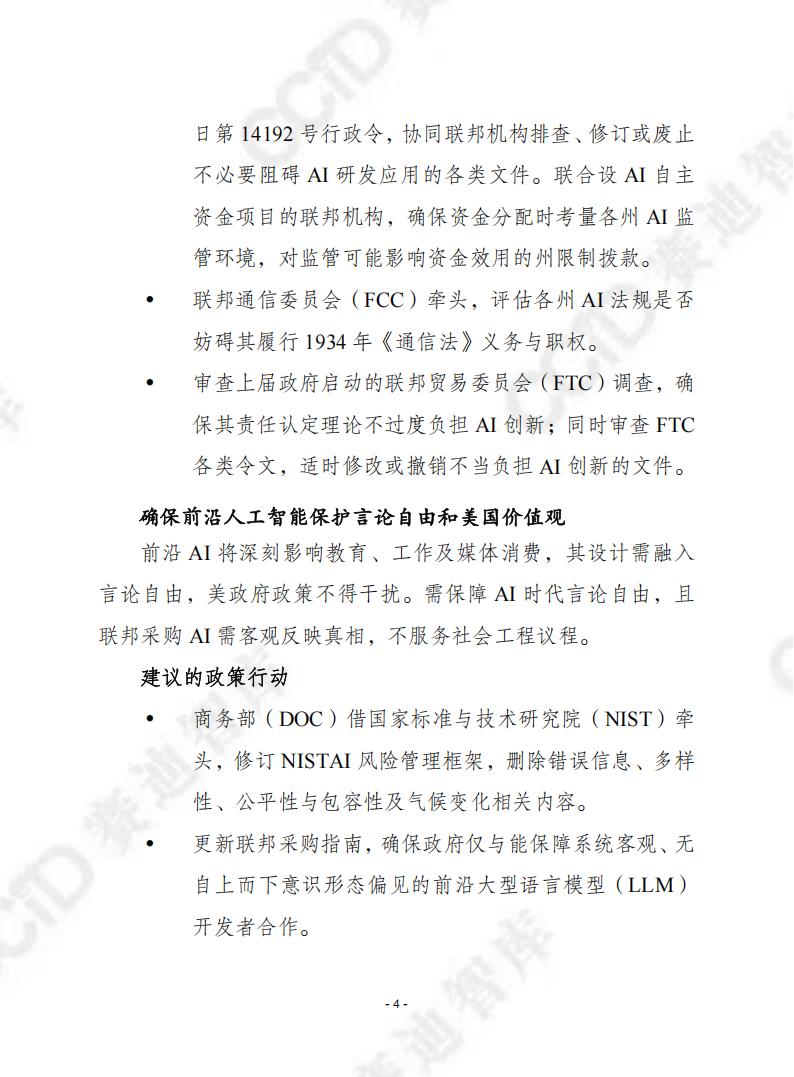 为保AI全球领先,美国私营部门需摆脱官僚束缚。特朗普已采取举措,如撤销拜登政府AI第14110号行政令,联邦不向设繁琐AI法规、浪费资金的州拨付相关资金,但不干涉各州通过审慎且不阻碍创新的法律。