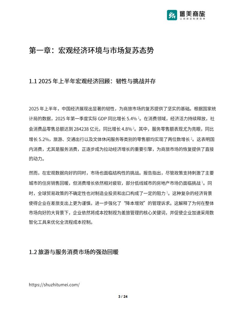 然而,在宏观数据向好的同时,市场也面临结构性的挑战。报告指出,尽管政策支持刺激了主要城市的住房销售回暖,但消费增长依然相对疲软,部分低线城市的房地产市场仍面临挑战¹。同时,全球贸易政策的不确定性也对制造业投资和出口构成了一定的阻力¹。这种复杂的经济背景使得企业在差旅支出上更为谨慎,进一步强化了“降本增效”的管理诉求。这解释了为何在整体市场向好的大背景下,企业依然将成本控制视为差旅管理的核心关键词,并促使企业加速采用数智化工具来优化全流程成本控制。