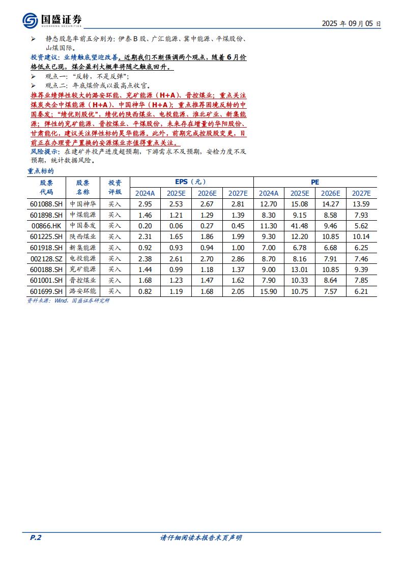 投资建议:业绩触底望迎改善。近期我们不断强调两个观点,随着6月价格低点已现,煤企盈利大概率将随之触底回升。