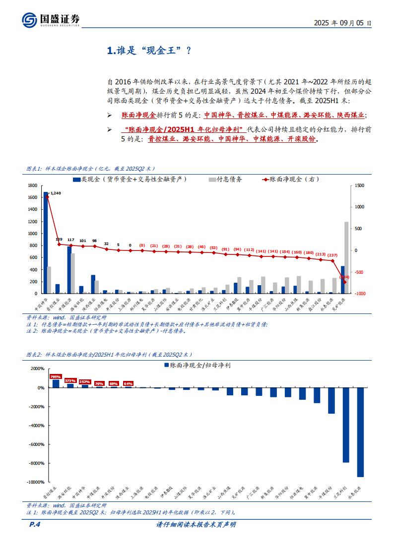 谁是“现金王”?自2016年供给侧改革以来,在行业高景气度背景下(尤其2021年~2022年所经历的超级景气周期),煤企历史负担已明显减轻,虽然2024年初至今煤价持续下行,但部分公司账面类现金(货币资金+交易性金融资产)远大于付息债务。截至2025H1末: