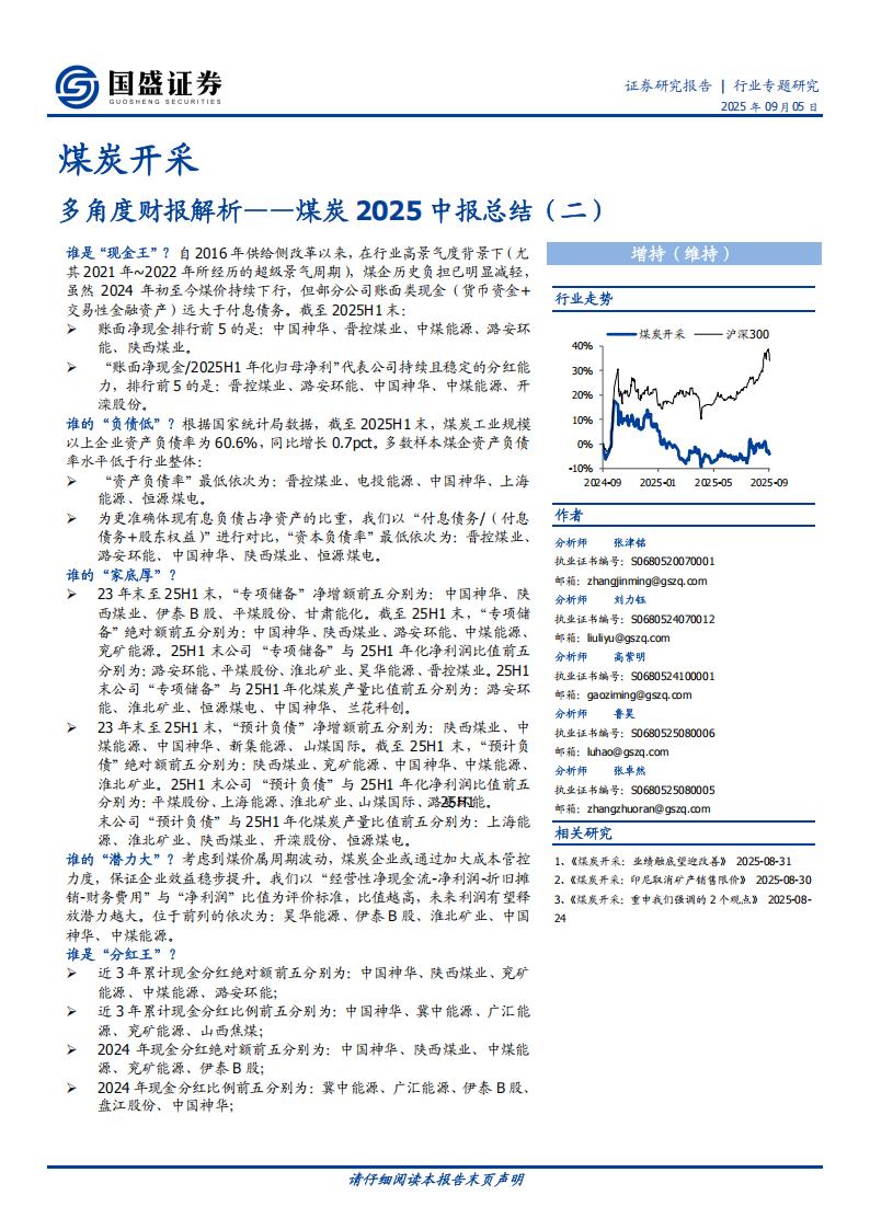自2016年供给侧改革以来,在行业高景气度背景下(尤其2021年~2022年所经历的超级景气周期),煤企历史负担已明显减轻,虽然2024年初至今煤价持续下行,但部分公司账面类现金(货币资金+交易性金融资产)远大于付息债务。截至2025H1末: