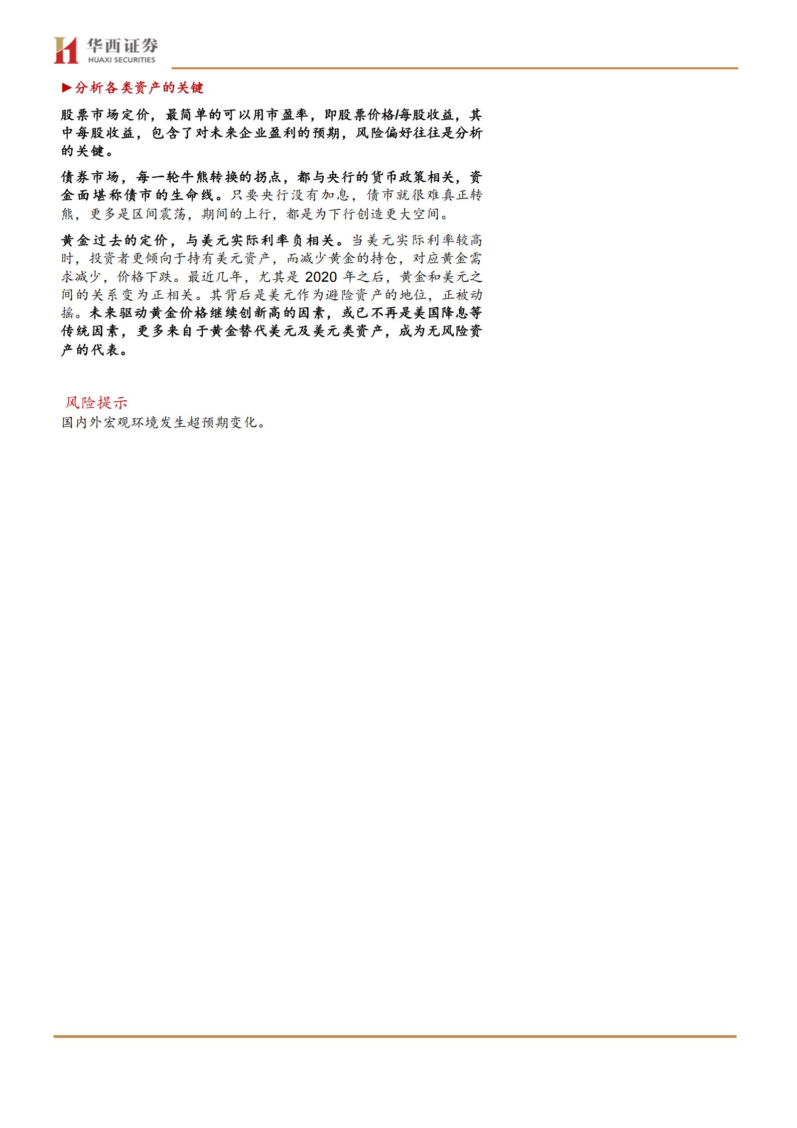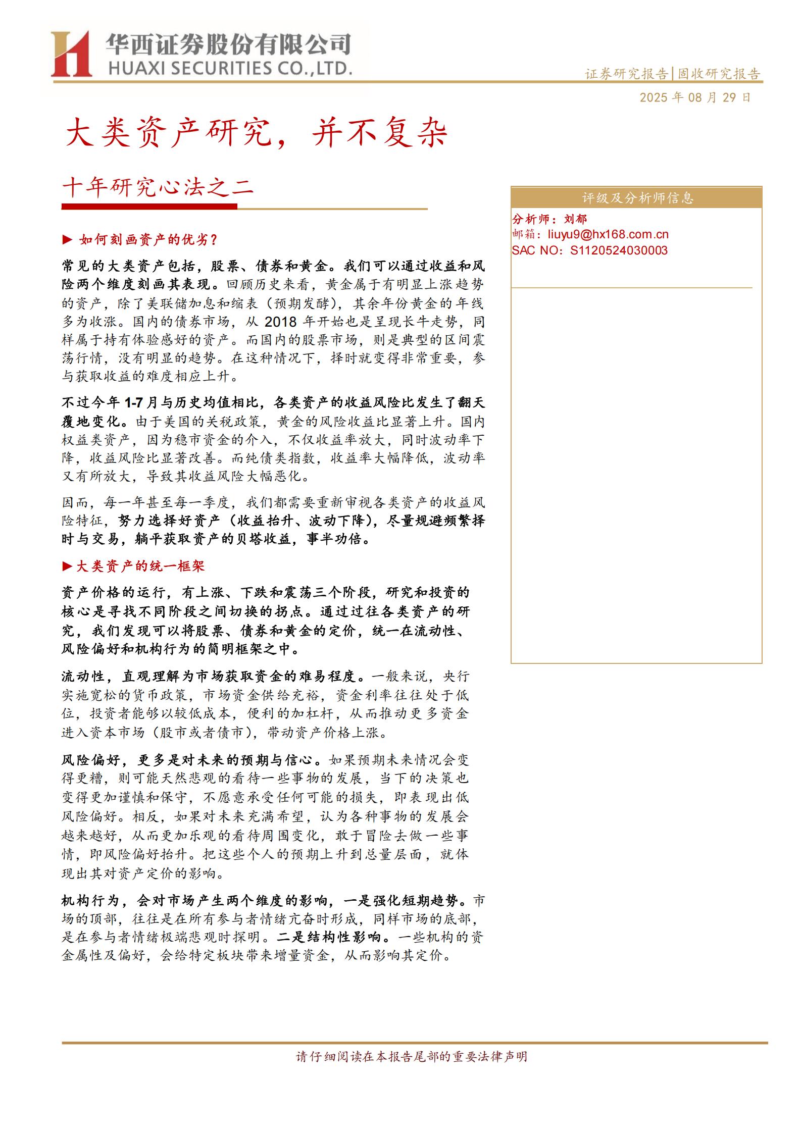 资产价格的运行,有上涨、下跌和震荡三个阶段,研究和投资的核心是寻找不同阶段之间切换的拐点。通过过往各类资产的研究,我们发现可以将股票、债券和黄金的定价,统一在流动性、风险偏好和机构行为的简明框架之中。