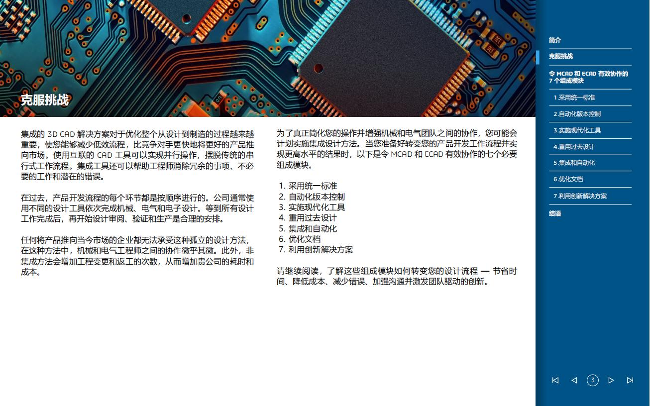 这一趋势倾向于既能实现机械功能,又能融合智能控制和连接的产品。机械系统和电子产品的相互依赖凸显了一项关键转变,因为这两个领域之间的联系越来越紧密。从更广阔的视角来看,MCAD和ECAD的集成为机械和电气工程师的协作与创新创造了不计其数的机会。集成的3D CAD解决方案对于优化整个从设计到制造的过程越来越重要,使您能够减少低效流程,比竞争对手更快地将更好的产品推向市场。使用互联的CAD工具可以实现并行操作,摆脱传统的串行式工作流程。集成工具还可以帮助工程师消除冗余的事项、不必要的工作和潜在的错误。