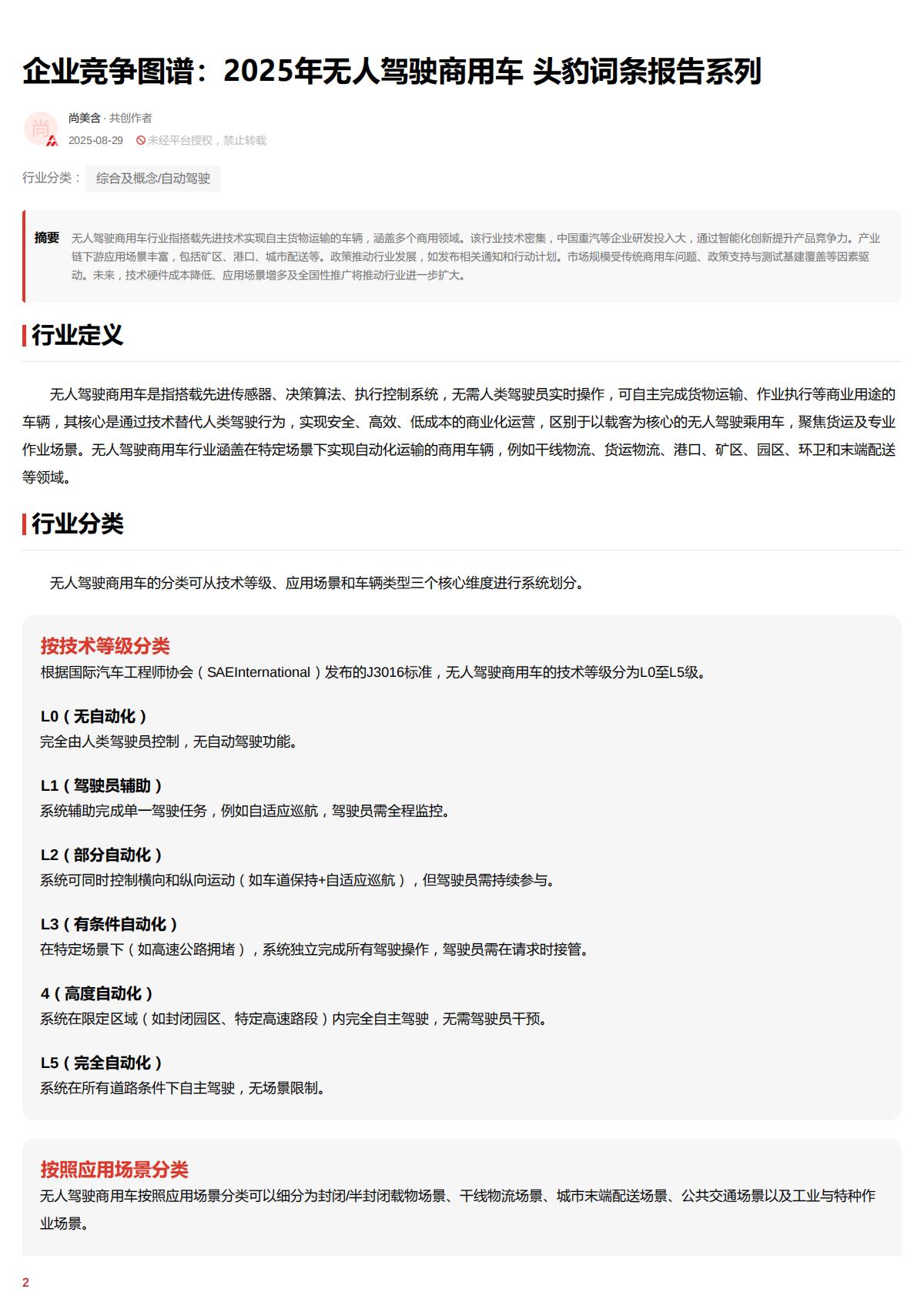 根据国际汽车工程师协会(SAEntemafional)发布的J3016标准,无人驾驶商用车的技术等级分为LO至L5级。