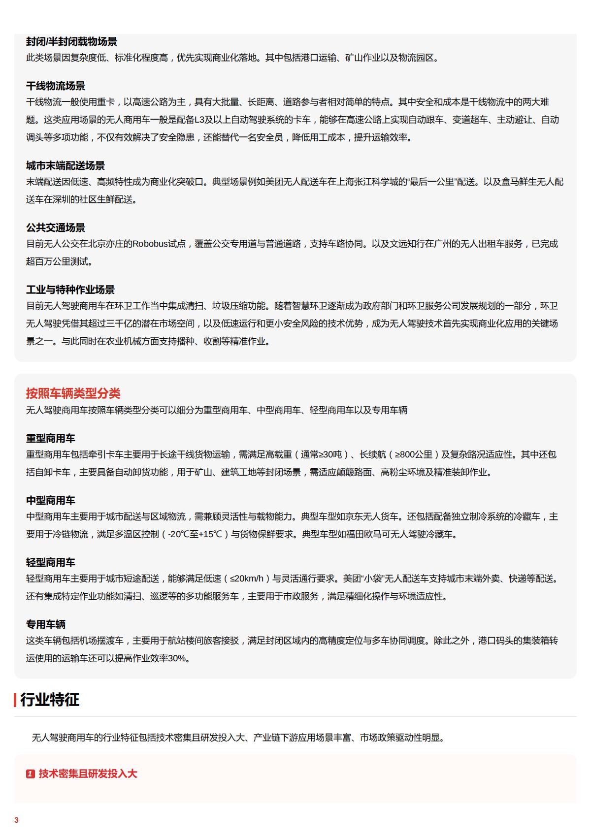 无人驾驶商用车的行业特征包括技术密集且研发投入大、产业链下游应用场景丰富、市场政策驱动性明显。